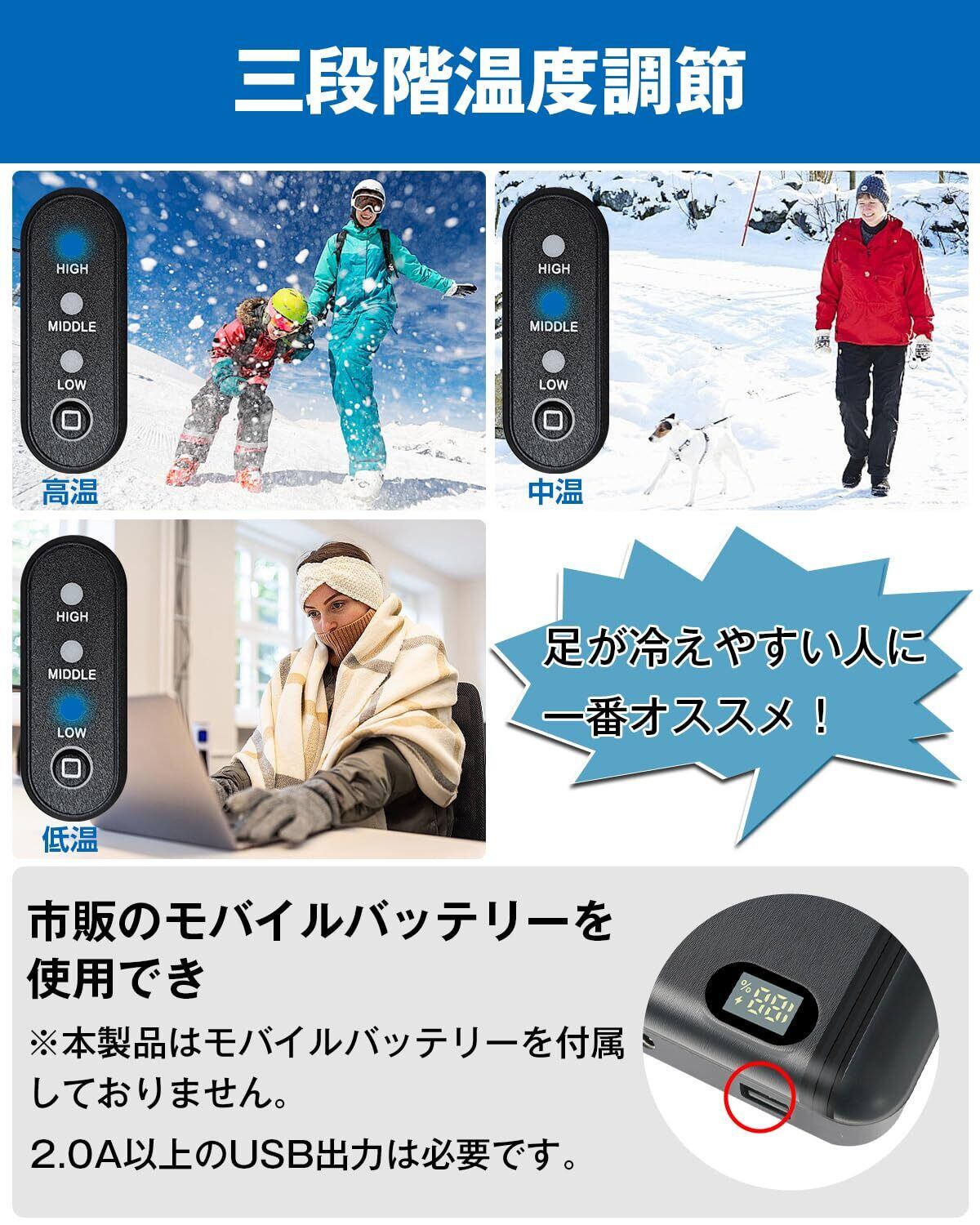 【各シーンで適用】このトゥーウォーマーは市販モバイルバッテリーを使用できます。※2.0A以上のUSB出力は必要です。軽くてコンパクトなので、寒い天気で通勤、通学、旅行、スキー、スノーボード、ハイキング、釣り、登山、バイクなど様々なシーンご活用頂けます。家族、親、友人に素敵な心温かい贈り物です。