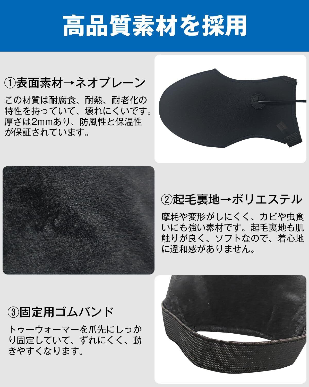 【高品質素材を採用され&保温】このトゥーウォーマー表面はネオプレーン素材を採用され、耐腐食、耐熱、耐老化の特性を持っていて、壊れにくいです。薄くても2mmの厚さがあり、足元を締め付けず、防風性·保温性にも優れています。生地はポリエステル、起毛裏地も肌触りがよく、柔らかくて、敏感肌でも安心な仕上がりで、着心地がいいです。