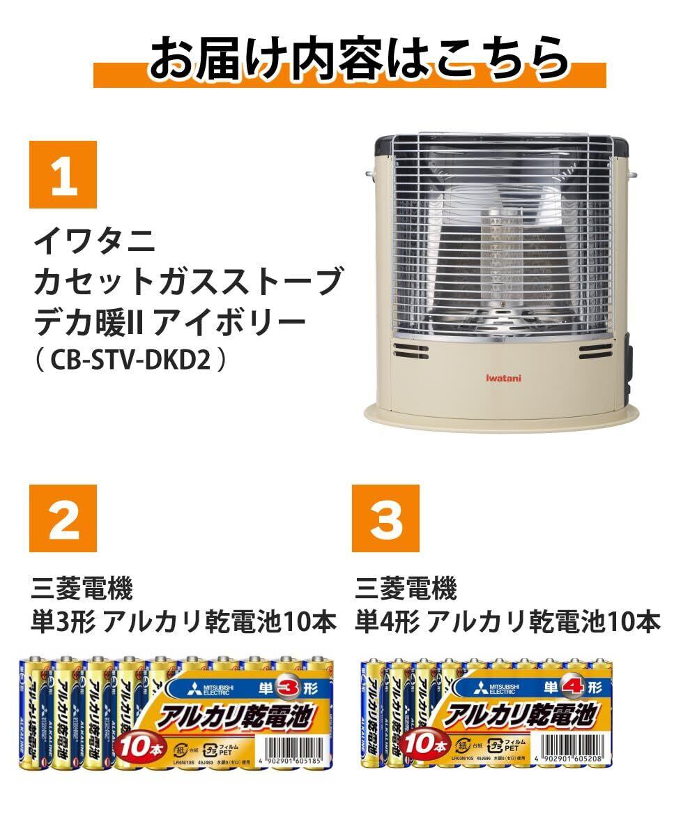【イワタニ ガスストーブ デカ暖2 セット内容】1)岩谷産業 CB-STV-DKD2 デカ暖 アイボリー、2)単3アルカリ電池10本、3)単4アルカリ電池10本