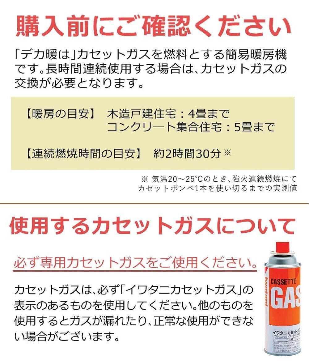 【イワタニ ガスストーブ デカ暖2 商品説明】 燃料がカセットガスだから、入手も交換も手軽。 交換時に手も汚さず操作も簡単。地震などの非常時にも役立ちます。 少ないガス消費量で、とっても暖かい暖房効力。 熱溜め燃焼筒とステンレス反射板によって前面広角に暖を輻射します。 ホースやコードがないので、足元を気にせず使うことができます。 リビング、キッチン、和室、玄関、脱衣所と 家中使うことが出来ます。