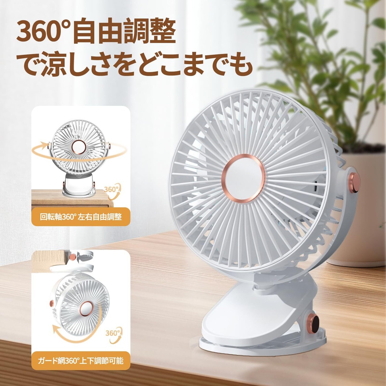 【卓上扇風機・クリップ・壁掛3つの使い方】これですクリップ式卓上扇風機は手動で左右上下に360度の調整が可能、どんな向きにも涼しい風を届けてくれます。クリップの力が強くて、落ちにくいデザイン、直径は約3-5cmまで固定可能、クリップ式で場所の制限がなく、卓上、車中、ホーム、オフィス等いろんなところで使用可能です。机の端を挟んでスペースが取らず、非常に使用便利、クリップ+コードレスでアウトドアにも大活躍。また、クリップの底部には壁掛け用フック穴があり、壁に掛けてもご使用いただけます。長押しすとる電源OFF、いちいち最後の風量モードまで押す必要がありません。エアコンと併用すれば、設定温度を抑えられるので節電につながり、一年中ご利用いただけます。