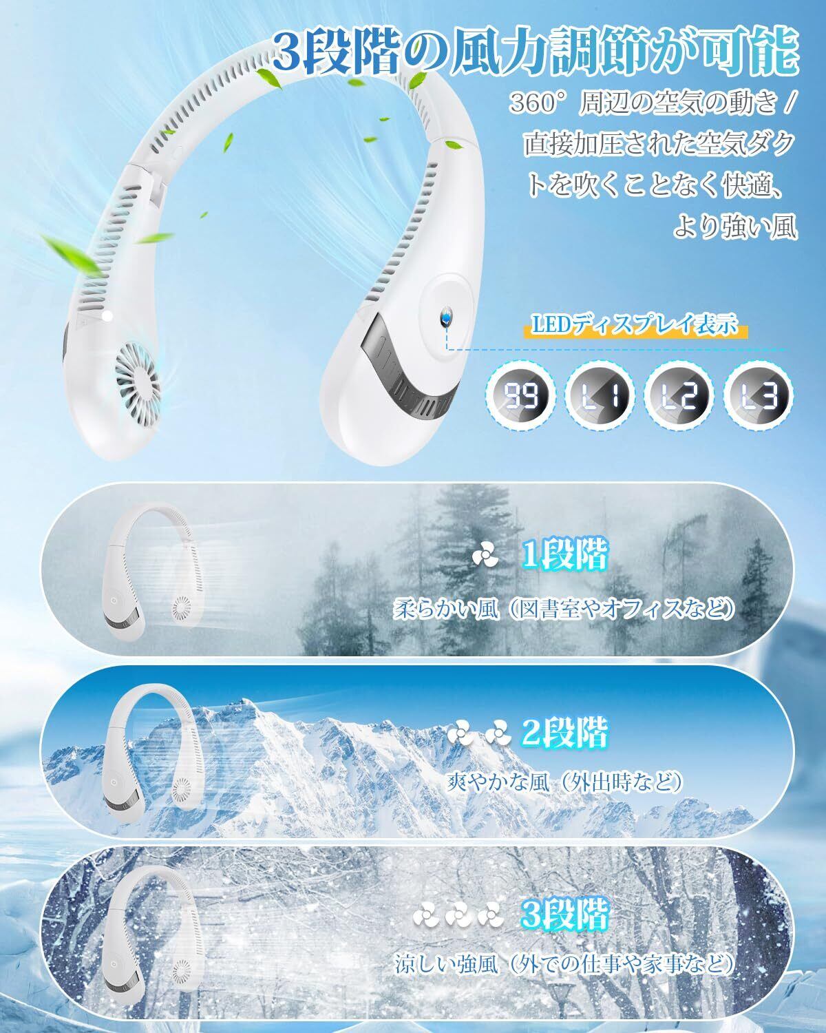 【ノイズが低い&3段階調整】独立したボタンで簡単に切り替えることができます、低/中/高速を含むもの。両側のツインタービンとツインダクトからのベニフィット。ネックファンは非常に低いノイズを生成します、より静かな冷却を楽しむことができます。