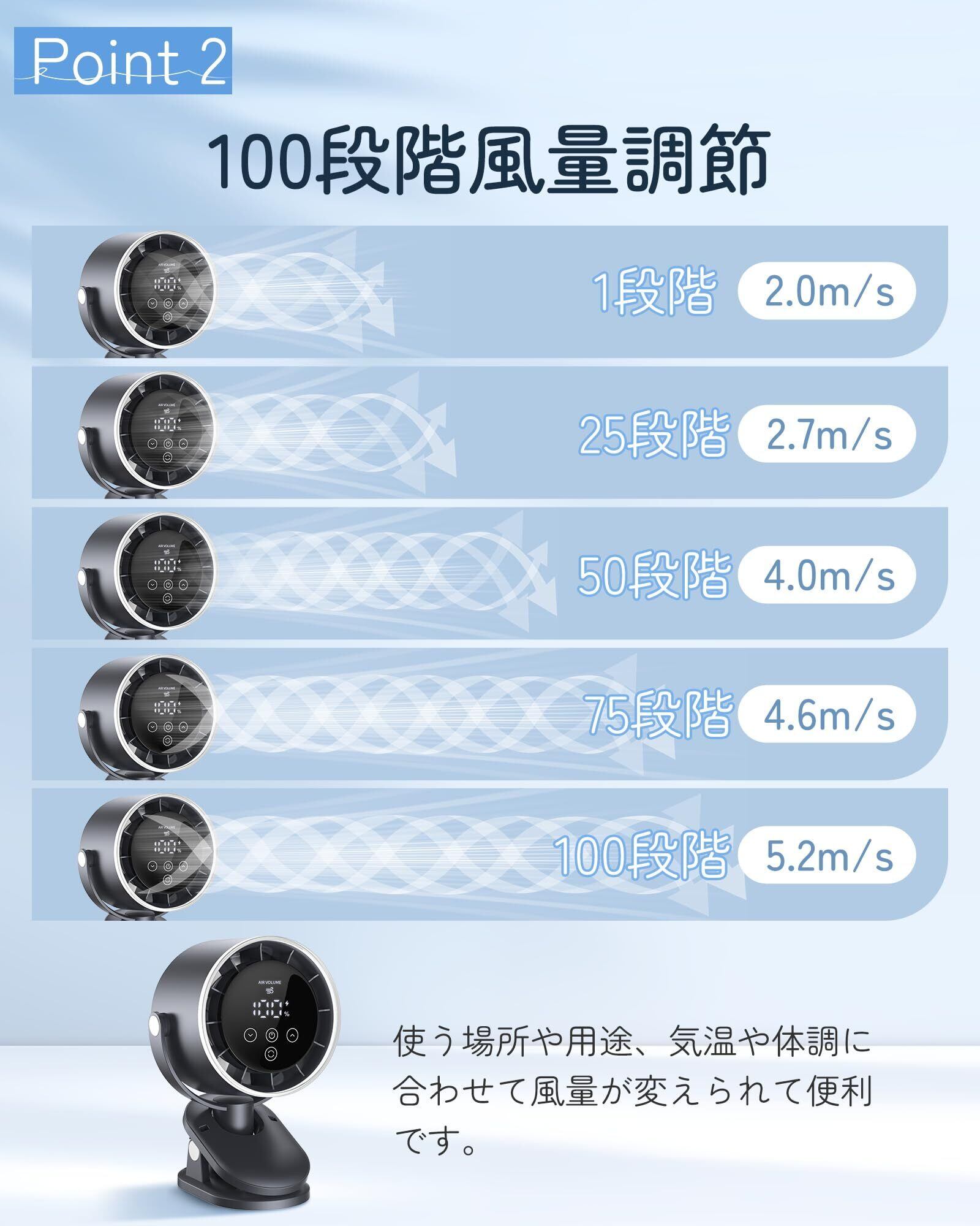 ■【風量100段階調節で最適な風を体感!】風量はなんと100段階調節が可能で、あなたの好みにぴったりの風を作り出せます。優しい風から強風まで、どんなシーンでもお好みの強さで風を楽しめます。特に熱中症対策には心強いアイテムです。