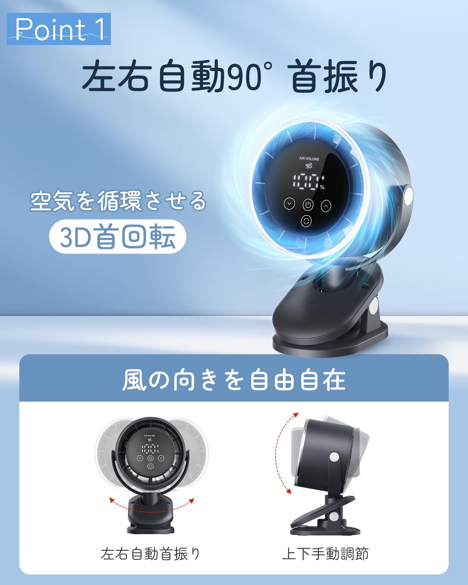 ■【自動首振り機能で快適な風を!】このクリップ扇風機は自動首振り機能を搭載し、広範囲にわたって涼しい風を送り届けます。特に暑い夏の日やアウトドアでの活動時に非常に重宝します。細かな風向き調整が可能で、あなたのニーズに合わせた快適な環境を実現します!