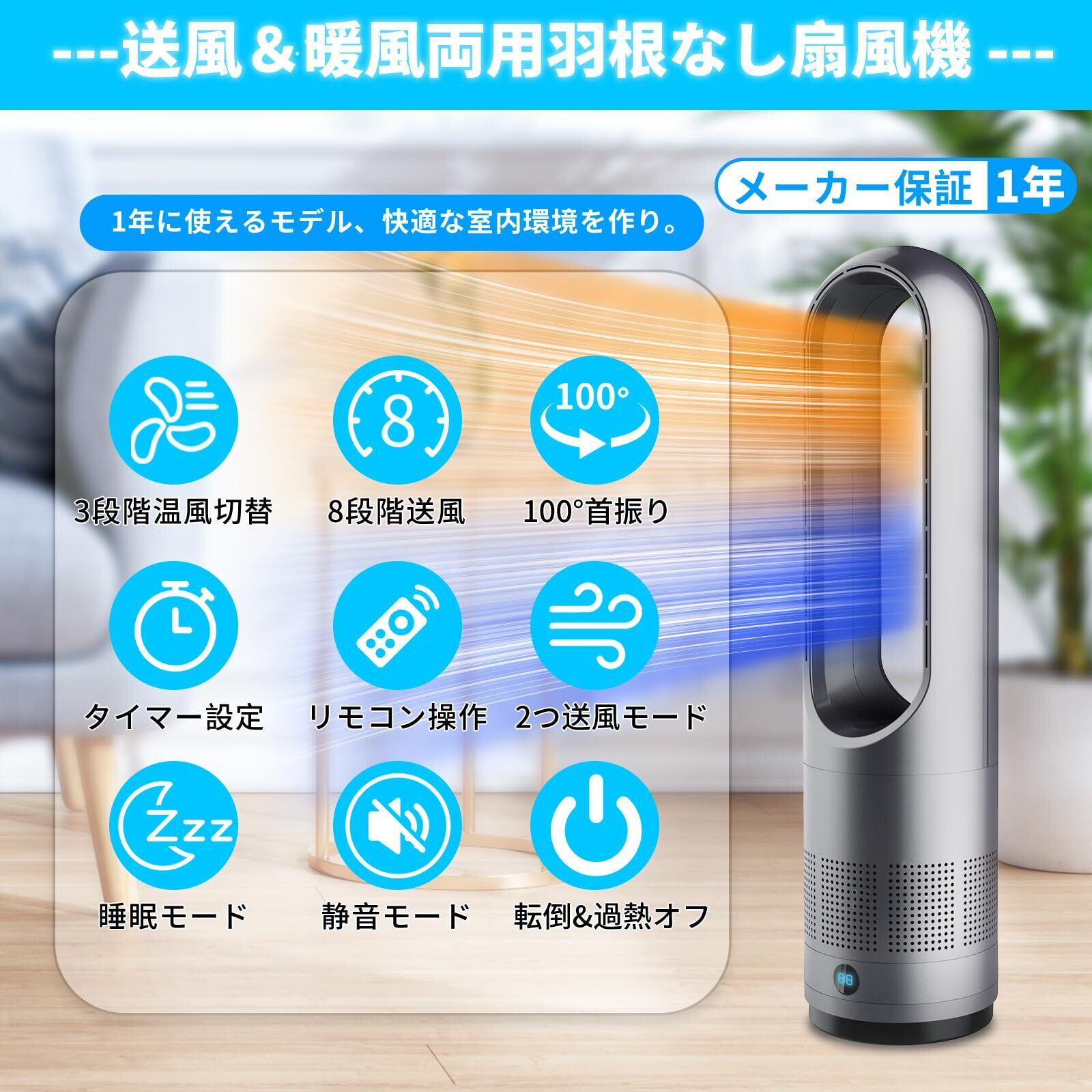 【2025年新型冷暖兼用・羽根なし】扇風機 タワーファン 8段階送風&3段階温風切替 左右100°首振り 9Hタイマー機能 温風 冷風 広範囲送風 羽根なし型 リビング扇風機 強力送風 大風量 リモコン付 暖風送風 ファンヒーター 過熱保護 転倒安全装置 即暖 省エネ 節電 子供部屋/リビング/寝室/書斎/キッチン/脱衣所/洗面所/トイレ/オフィス用 日本語説明書 PSE認証済み(グレー)