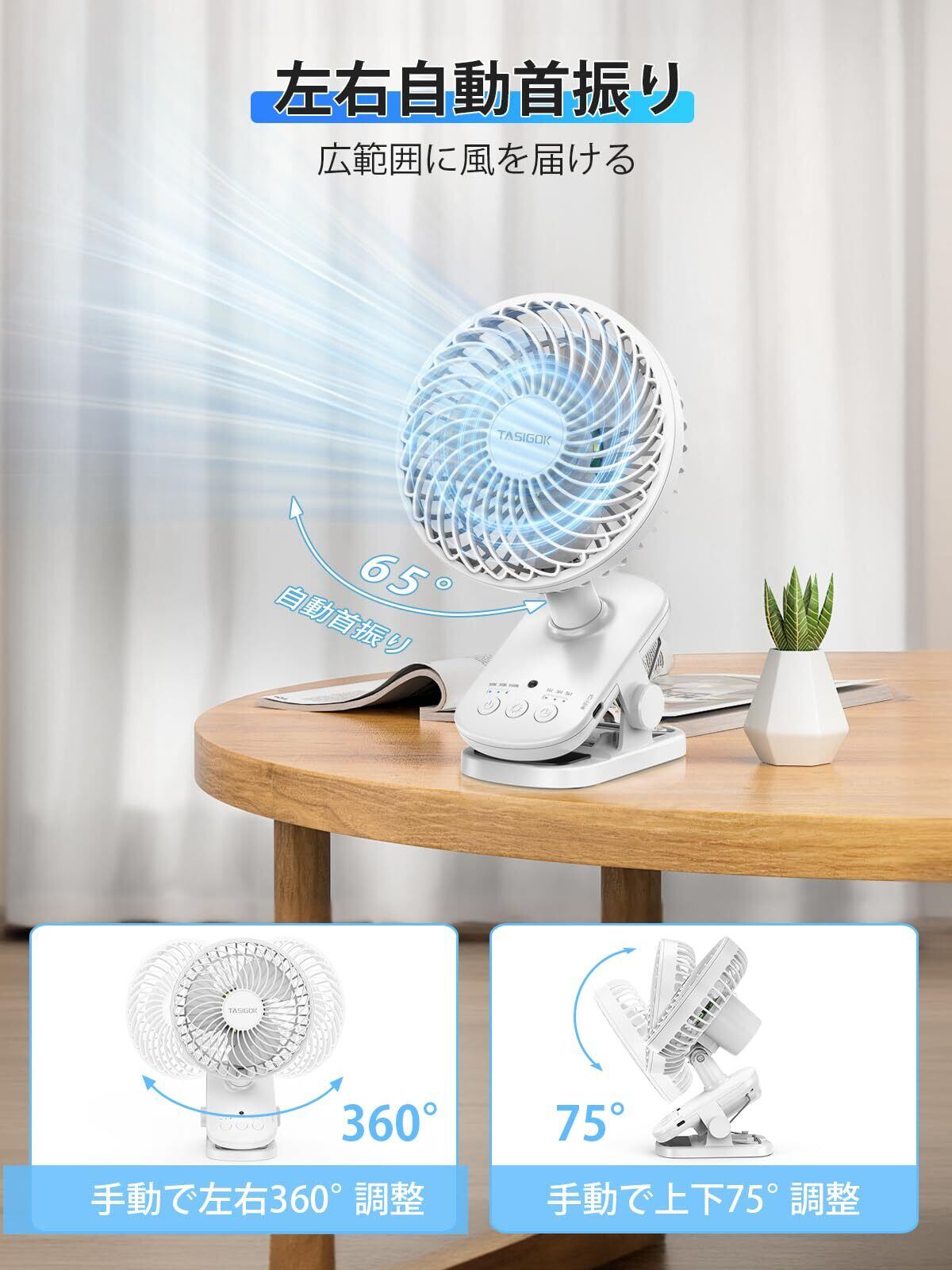 【数量限定】Tasigok USB扇風機 卓上 自動首振り 小型 車用 静音 dcモーター 充電式 クリップ 45時間連続使用 4段階風量 6000mAh リモコン LEDライト タイマー 壁掛け dcモーター ミニ サーキュレーター 強力 コンパクト デスク ファン リビング キャンプ アウトドア トイレ 脱衣所 ホワイト