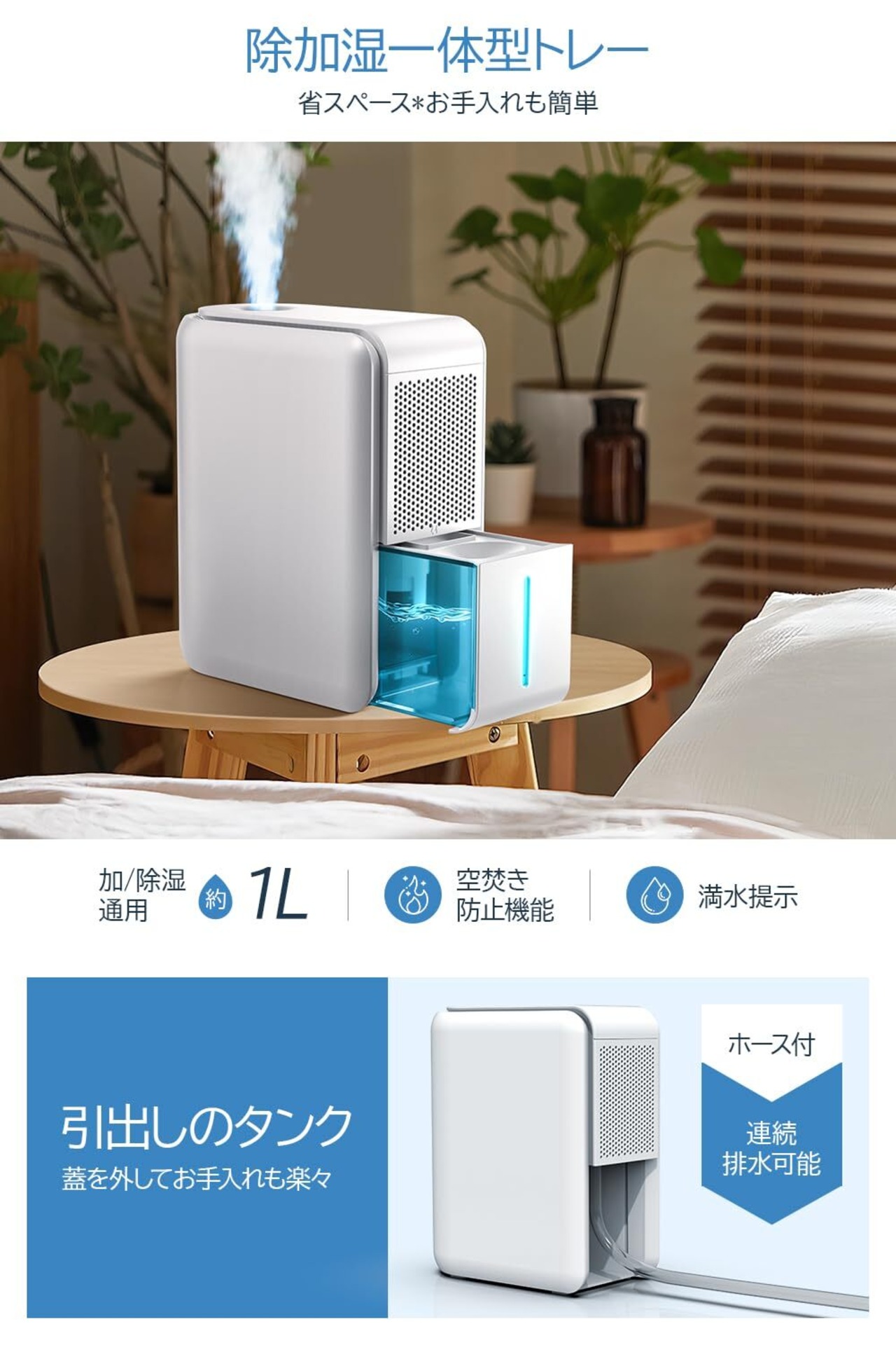 ■【便利な1L大容量タンク!】透明な水タンクを搭載しており、溜まった水量が一目で確認できます。タンクが満水になると自動的に運転停止し、安心して使用できます。手間いらずの設計で、清潔に保つことができます。