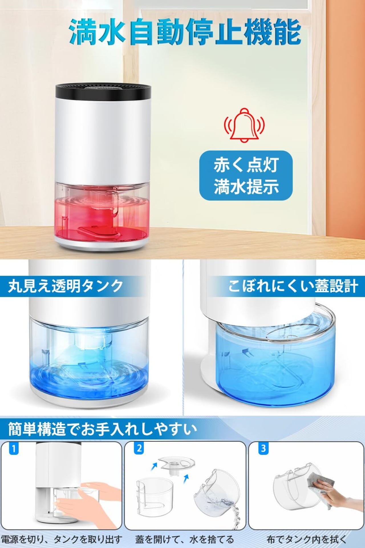 特徴 1000MLの大容量水タンク, 取り外し可能, 小型軽量, 強力除湿, 消灯可能な7色ライト