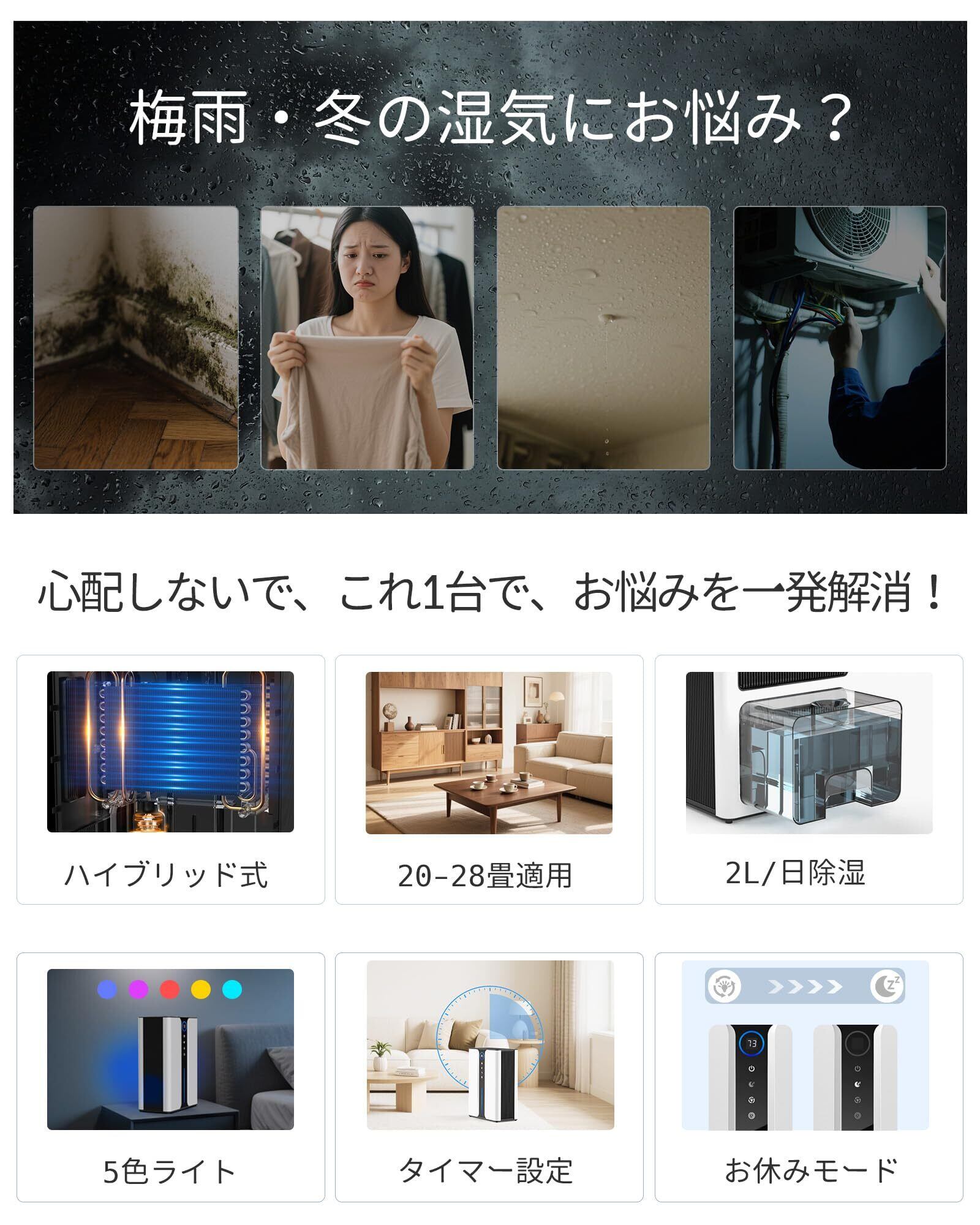 除湿機 ハイブリッド式 【2025年最新・2L/日強力除湿】 大容量3Lタンク 20-28畳対応 衣類乾燥 除湿器 タイマー付き 5色ライト 静音設計 省エネ 除湿空気清浄機 部屋干し カビ/梅雨対策 満水自動停止機能 寝室/脱衣所/台所/押入れ/トイレ/クローゼット 持ち運び便利 取扱説明書 PSE認証済