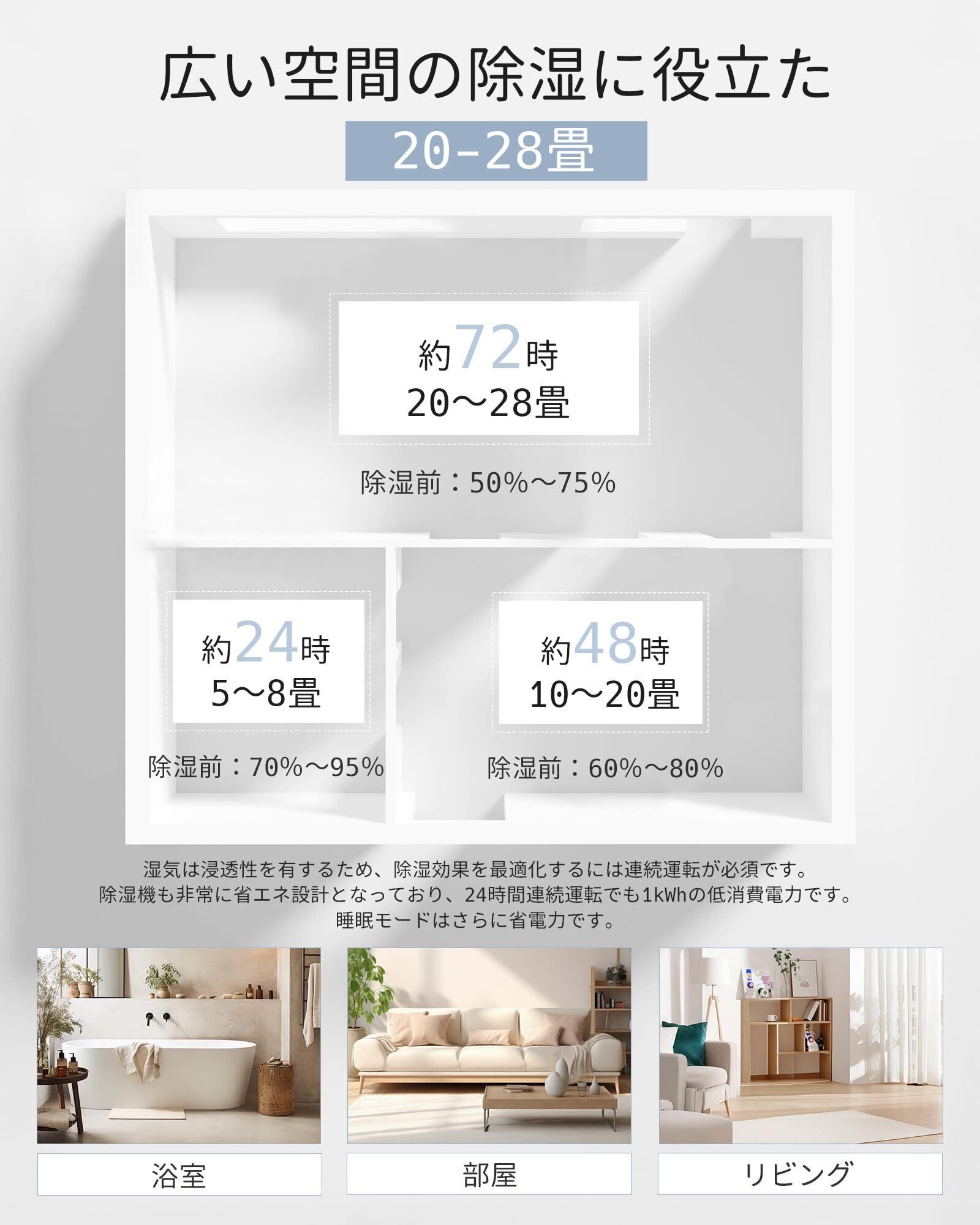 【パワフル除湿&大容量3Lタンク】 1日あたり最大2Lの強力な除湿能力(室温30℃、湿度80%RHの場合)で、20-28畳の広い空間にも対応。リビング、寝室、浴室、クローゼットなど、家中の湿気対策に活躍します。3Lの大容量排水タンクを搭載しており、頻繁な水捨ての手間を軽減。透明な水位窓で残量が一目で分かり、満水時には自動停止機能が作動するため、水漏れの心配なく安心してご使用いただけます。