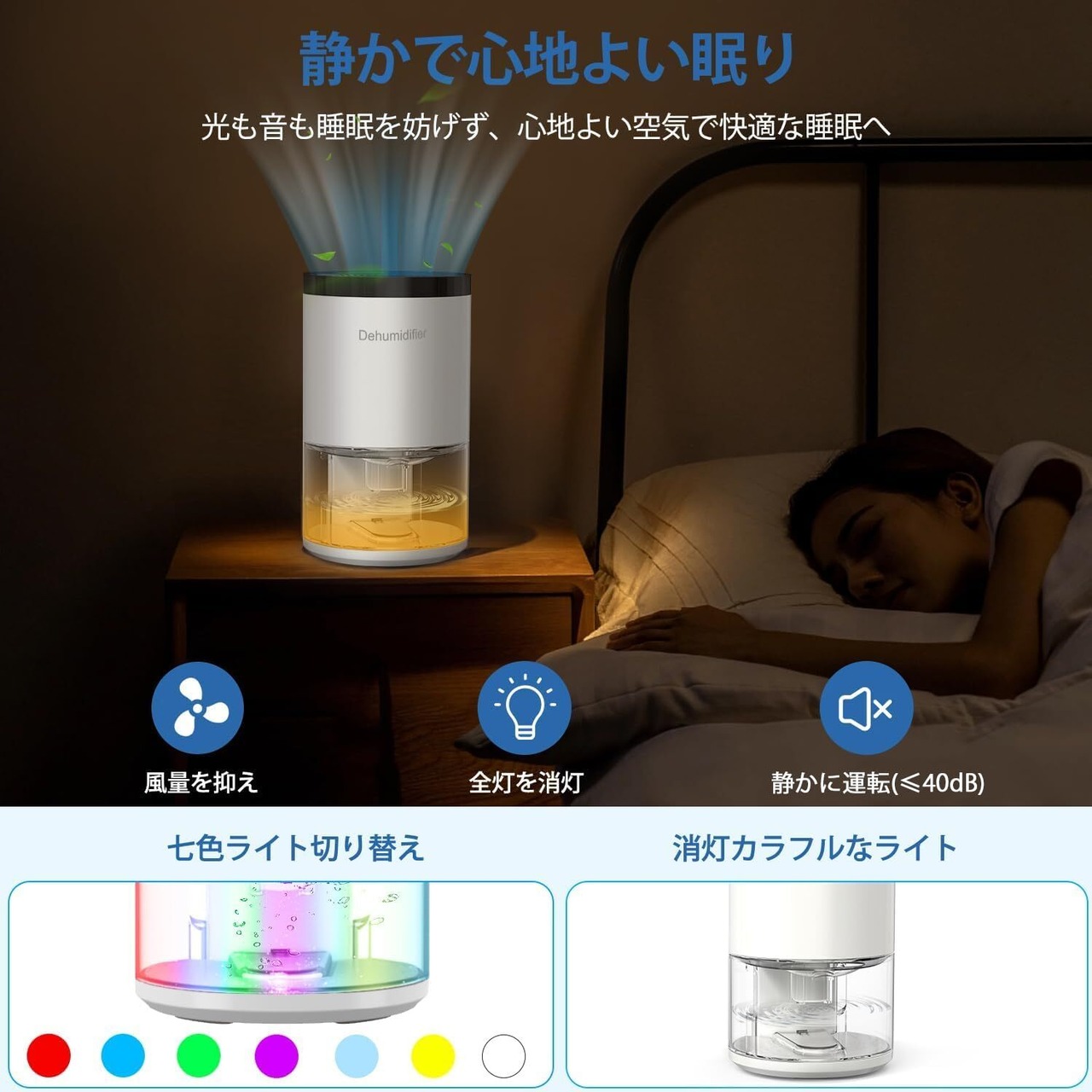 【コスパ超~高・省エネ・七色ナイトライト】デシカント式除湿機と比べて、こちらの小型除湿器はヒーターを使用しないのため、 夏場でも室温を上げることがなく快適に使用することができるほか、ただ40Wの消費電力で環境にも優しい!電気代は1時間あたり約1円、お財布に優しいです。7色ライト付き、癒しの光でもっと快適な空間に。ライトの消灯、色ロックもワンタッチで制御できます。光に敏感する方々が夜にライトを消灯し、静かな環境でぐっすりと眠ります。40dB以下の静音運転で、仕事中や読書中、睡眠中でも快適に使用できます。