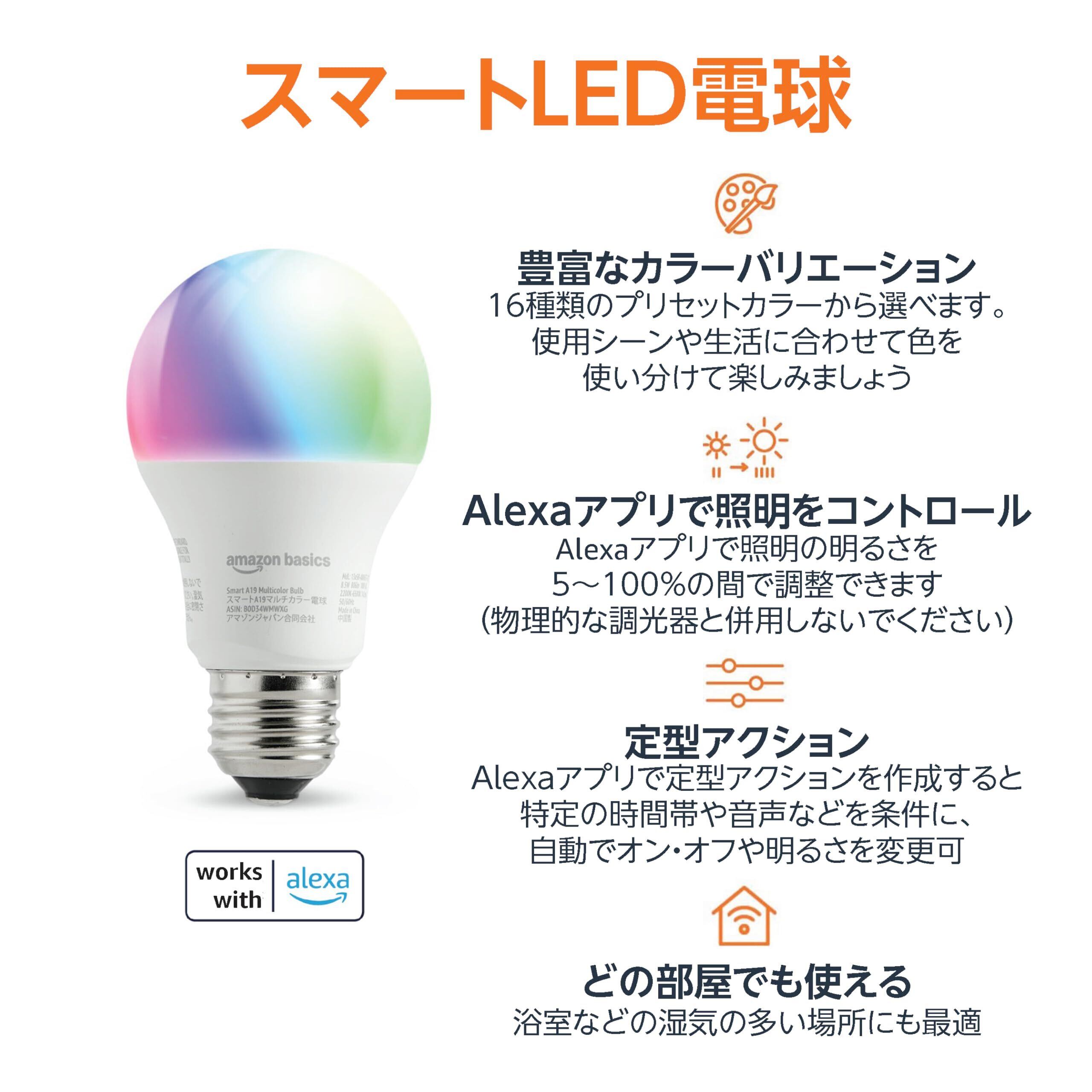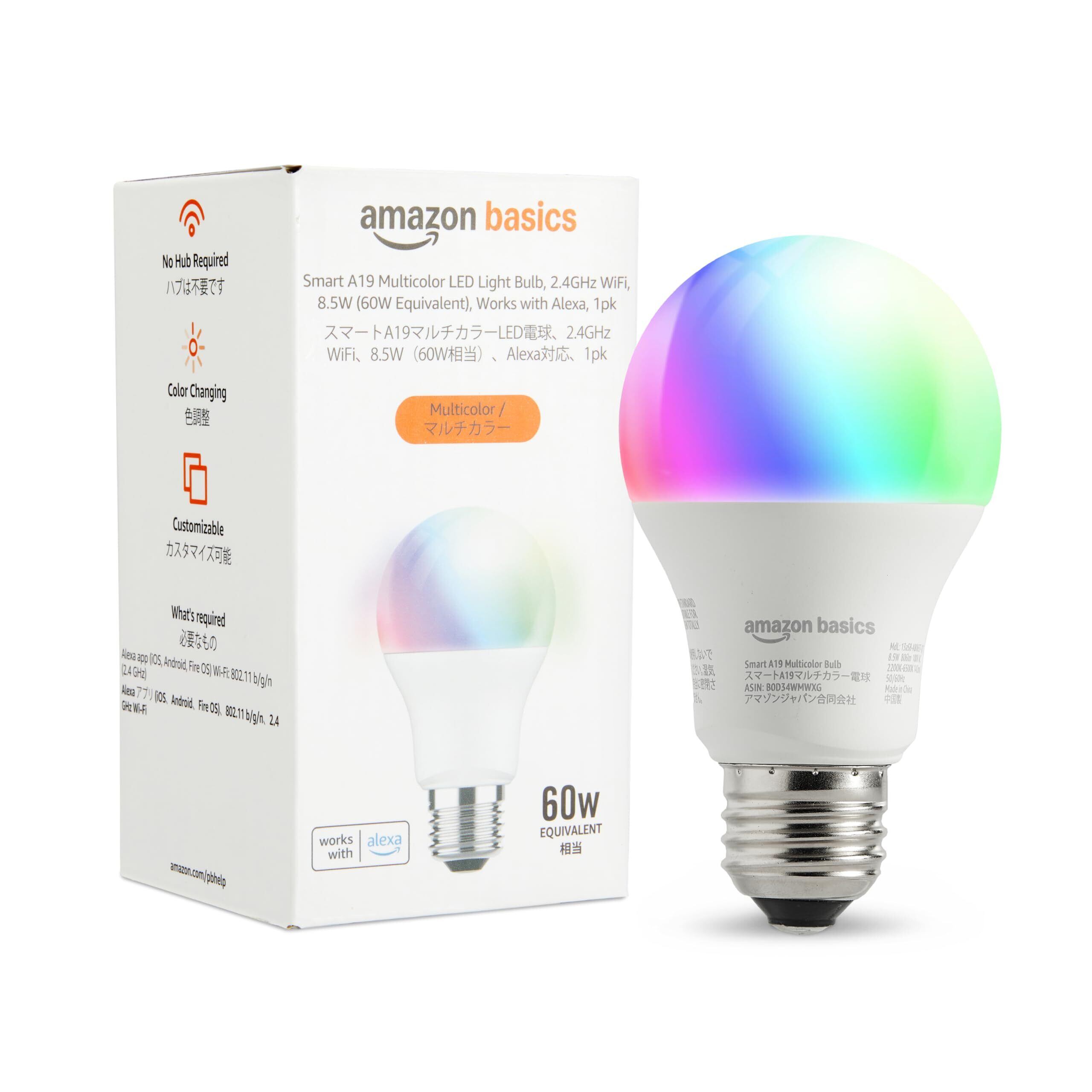 ベーシック スマートLED電球 Alexaのみ対応 A19 E26 色合い 調光可能 マルチカラー Wi-Fi (2.4GHz) 対応 800 lm (60W相当) 1個入り