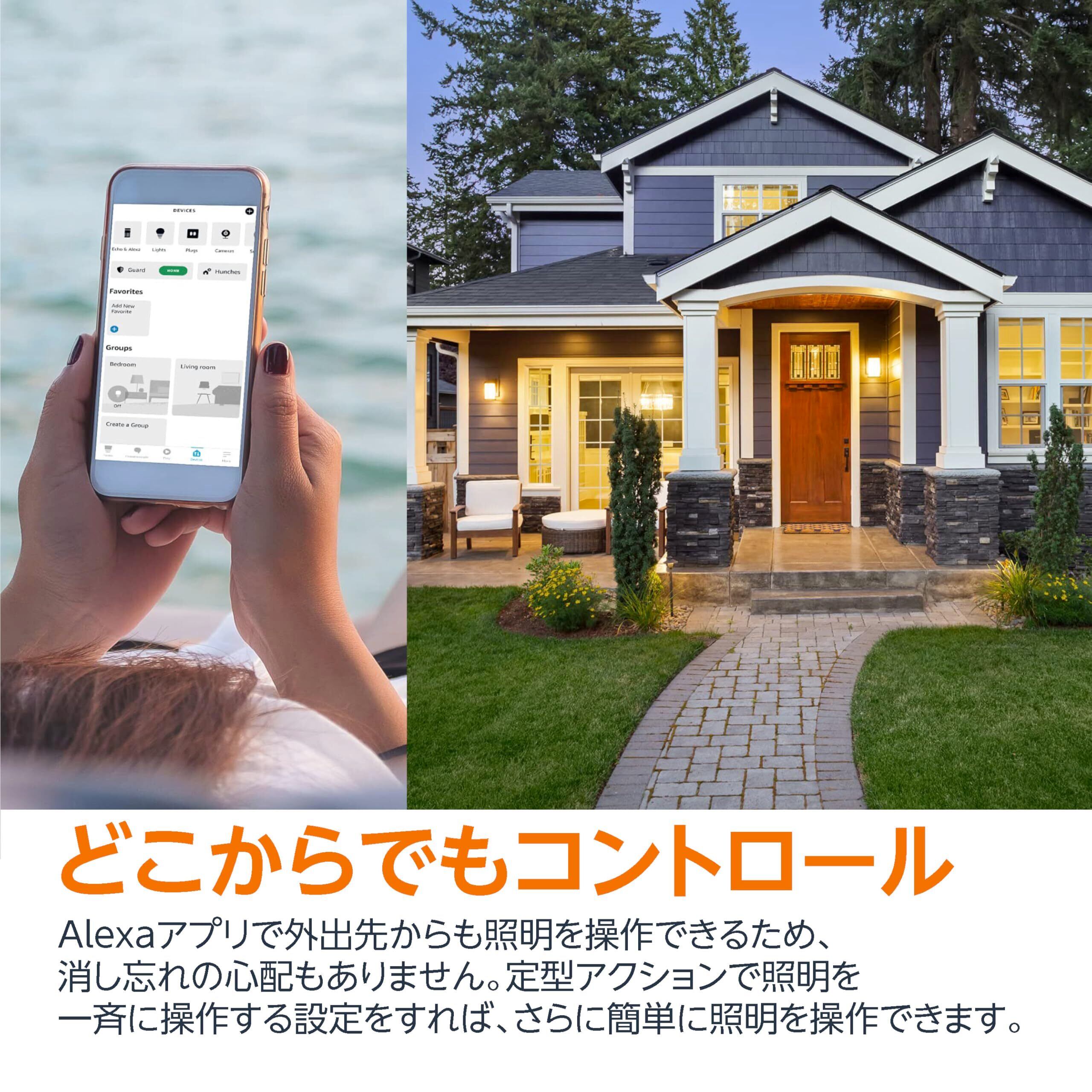 【グループ制御】Alexaアプリでグループを作成して照明を組み合わせると、Alexa対応デバイス(別売)を通じた音声コマンド/Alexaアプリの使用で、部屋ごとの照明・家のすべての照明を制御できます。寝る時間になったら、"アレクサ、寝室の電気を消して"と話しかけて電源をオフにすることも、Alexaアプリで寝室の照明を一気に消すこともできます。