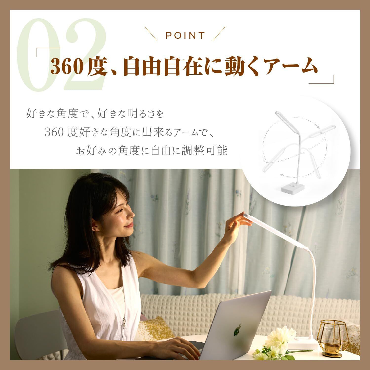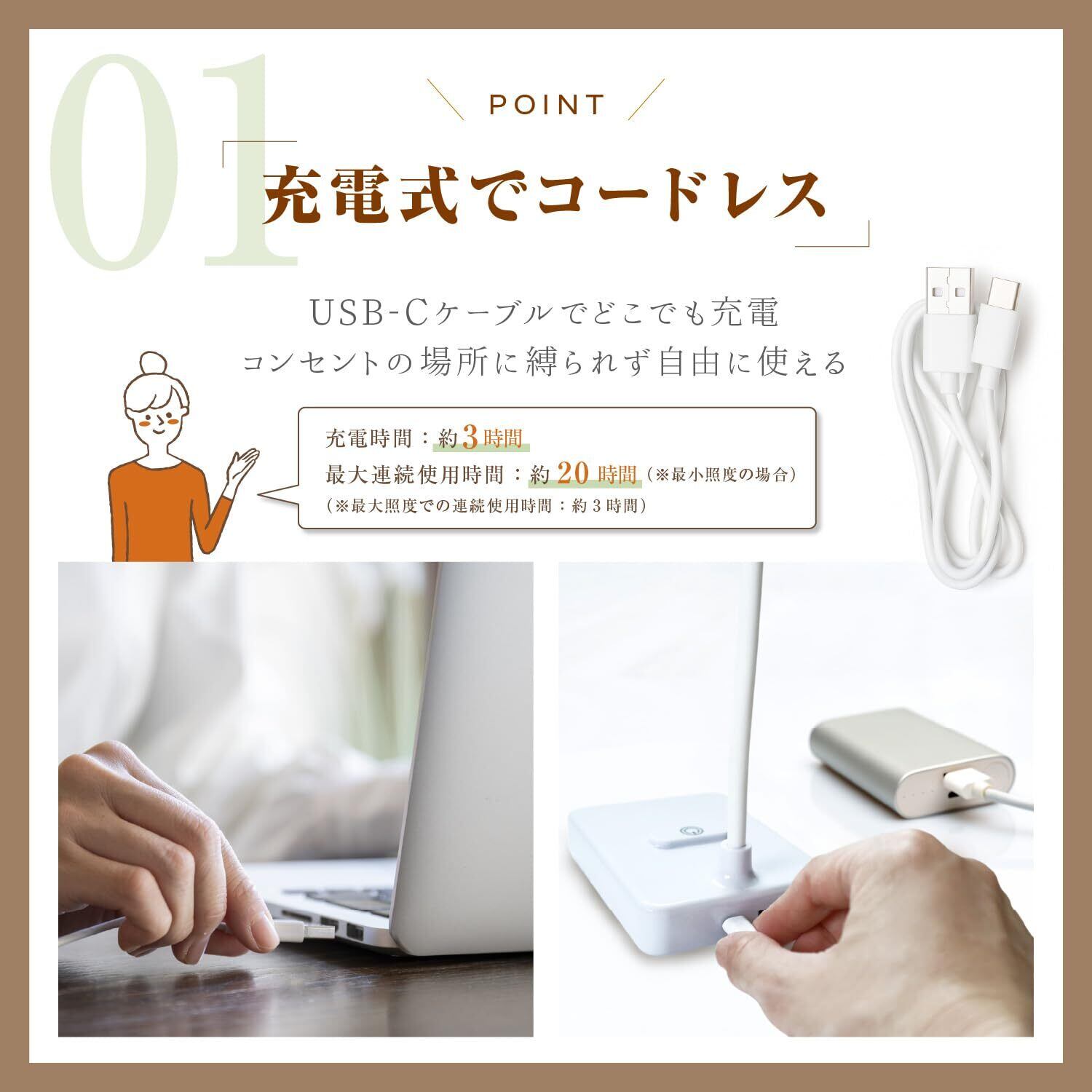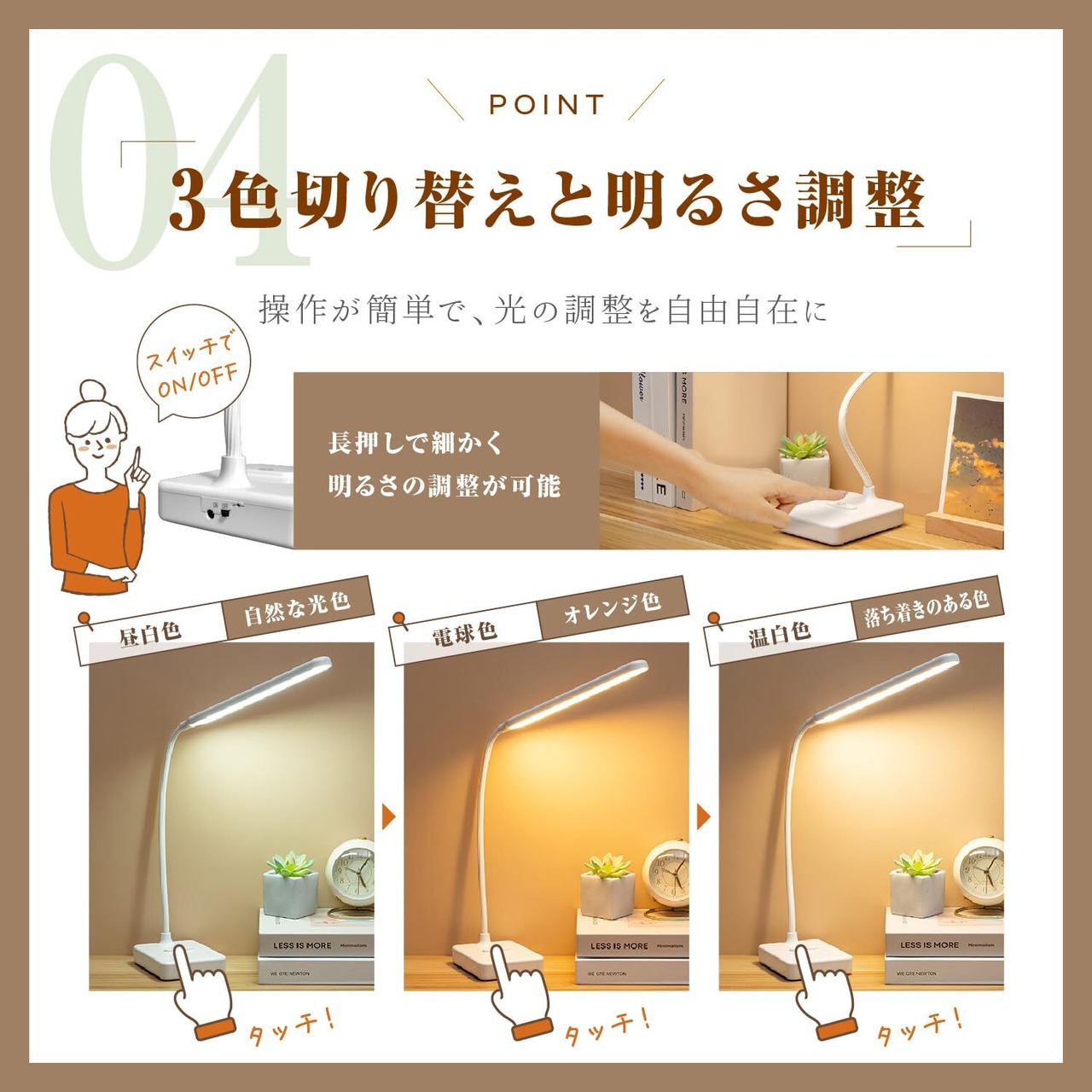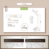 【無段階調光&3色切替でシーンに合わせた明かりを】 明るさを自由に調整できる「無段階調光」機能を搭載。ボタンを長押しすることで、低輝度から高輝度までお好みに合わせた明るさに設定可能です。さらに、白色光・暖色光・自然光の3つの色温モードをワンタッチで切替でき、読書・仕事・就寝前など、シーンに合わせて使い分けできます! 【タッチ式スイッチで静かに操作】 タッチセンサー式のスイッチを採用し、音を立てずに電源のオンオフや調光が可能。長押しで明るさ調整、短押しで色温切替と直感的に操作できます。集中したい深夜の作業や勉強中にも音を気にせず使えます。 【目に優しい光設計&ブルーライト軽減】 高品質LEDチップを30個搭載し、ちらつきのない安定した光を実現。光が均一に広がる設計で、目にやさしく、長時間の読書やデスクワークでも負担を軽減します。また、ブルーライトを抑えた設計で、お子さまの学習用にもおすすめです✨ 【USB充電式&コードレスで使いやすい✊】 付属のUSBケーブルで充電でき、コードレスでも使用可能。コンセントの位置を気にせず、寝室やリビング、持ち運びにも便利です。リチウム電池は交換にも対応しており、長くご使用いただけます。 【自由に曲がるフレキシブルアーム】 やわらかく自由に動かせるアームを採用しており、照らしたい位置にしっかり光を当てられます。スリムでシンプルなデザインは、様々なインテリアに馴染み、省スペースで設置できるのも魅力です✨