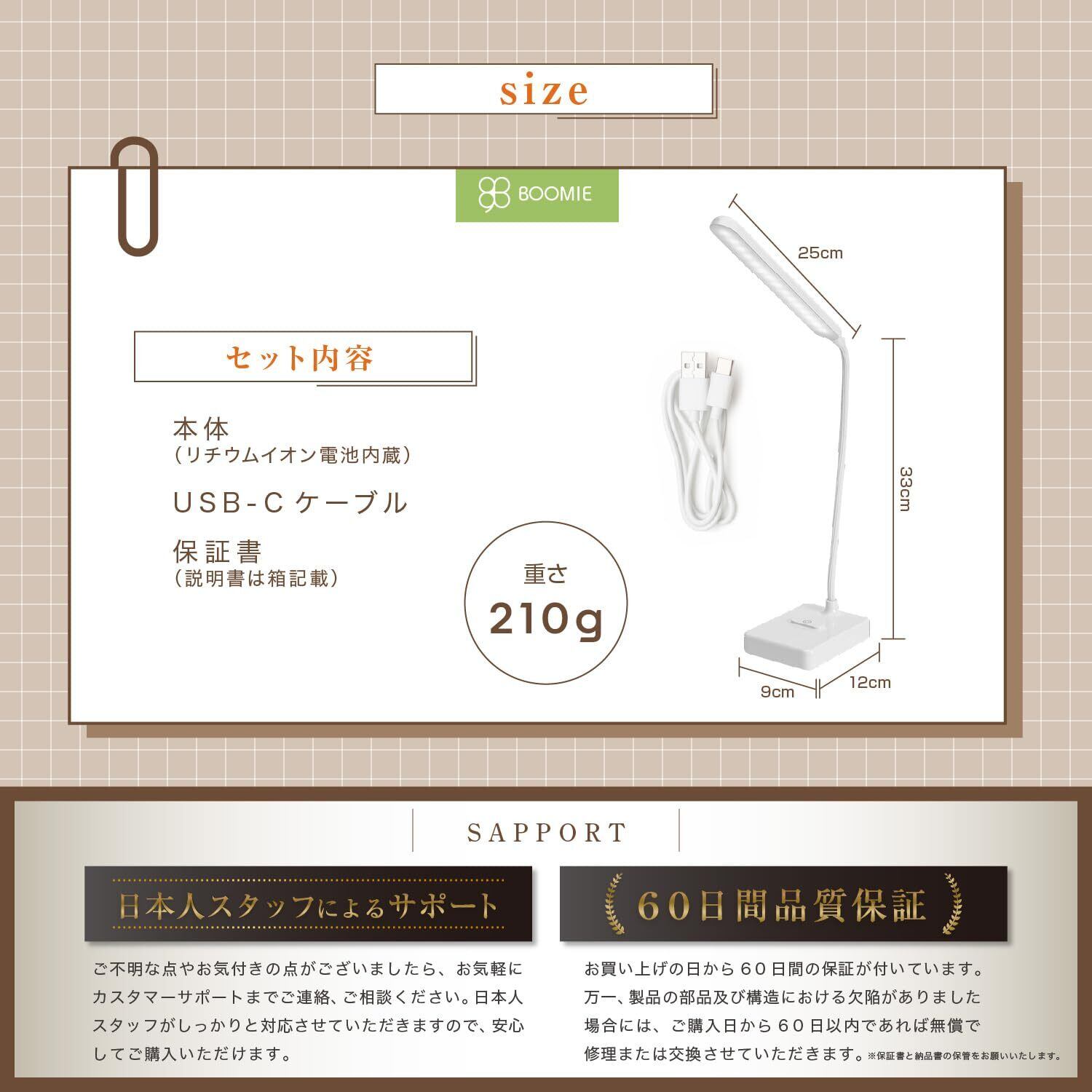 消費電力:2.5W LED数:30個(5730型LEDチップ) 本体サイズ:ライトヘッド25cm/支柱29cm/ベース12×9cm 材質:ABS樹脂