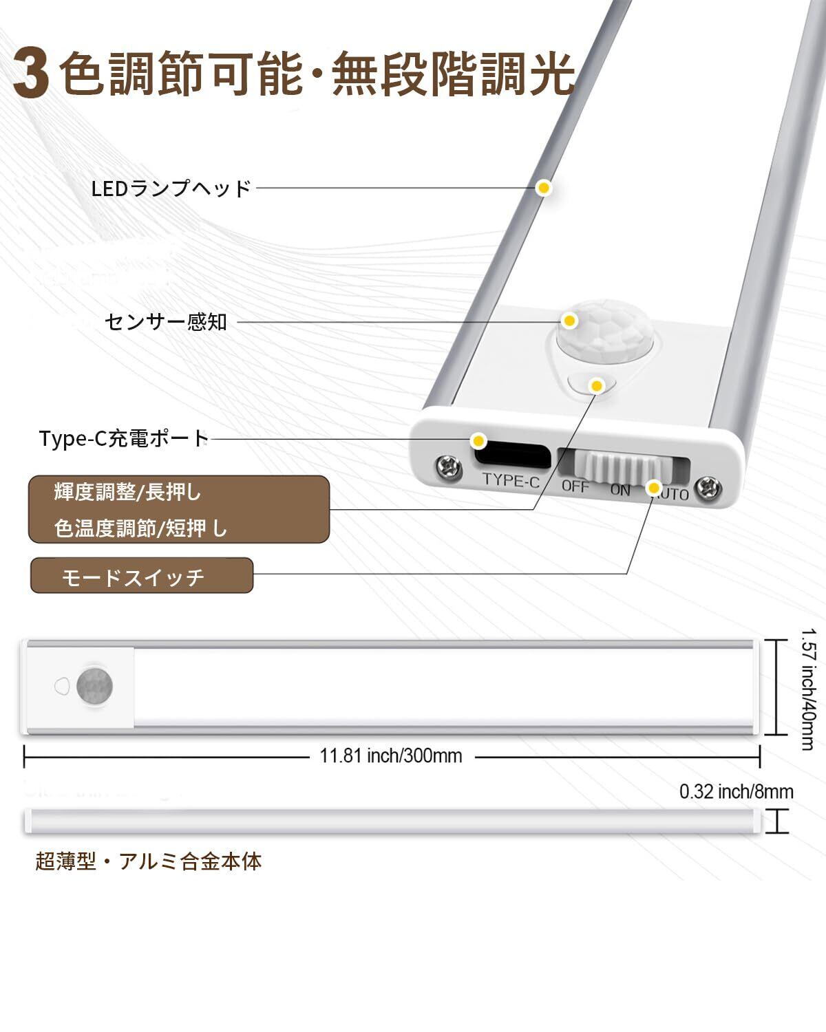 【在庫限り】【連続点灯60時間可】人感センサーライト 室内 じんかんせんさー 充電式 マグネット LEDバーライト 読書灯 棚下 Type-C 充電式 無段階調光 キッチン用 屋内 寝室 廊下 階段 玄関 階段 3000K/4500K/6000K 電球色 昼白色 昼光色調整 30cm 2本