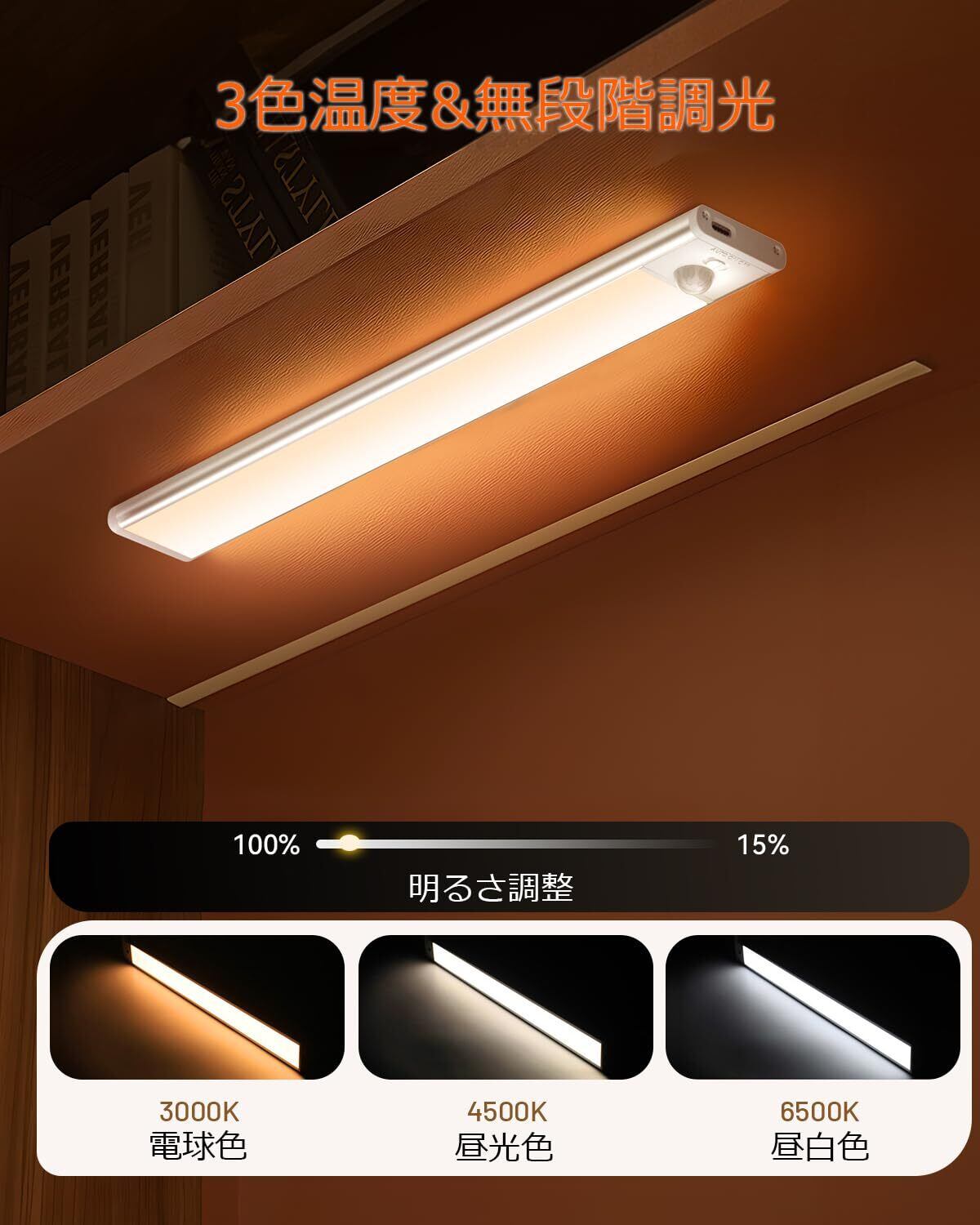 【3色調節可能・無段階調光・目に優しい】人感センサーライトは場所に合わせて昼光色/昼白色/電球色3色からお選びいただけます。それで、10%~100%の照明輝度を調整して、目に優しくて、周りの人に迷惑をかけたりしない無段階調光できます。