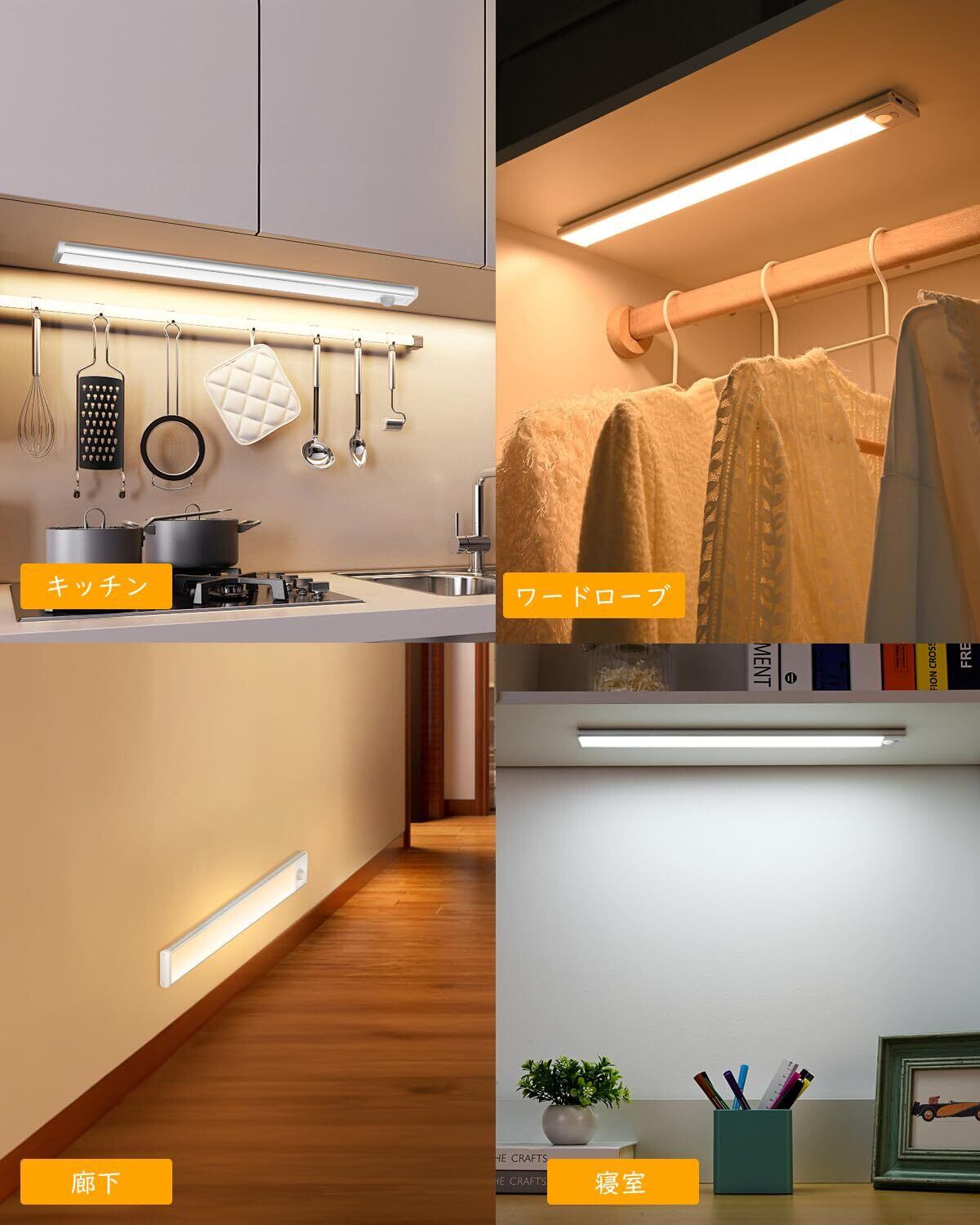【超薄型・アルミ合金本体】長さ300*幅42*厚み9mmのコンパクト仕様で、設置後も場所を取らずに控えめに配置することができます。クローゼットをはじめ、寝室、玄関、階段、廊下、地下室、食器棚、ガレージ、倉庫、戸棚など、さまざまな場所で使用することができます。