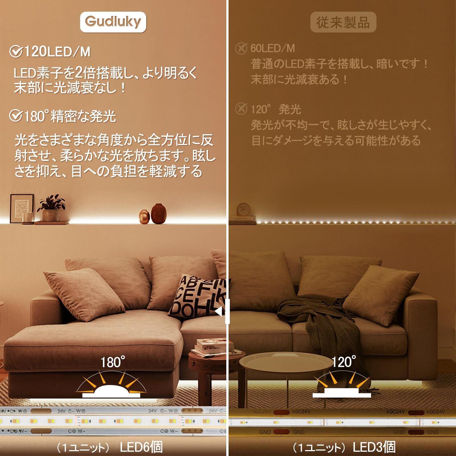 【2025年進化版・高輝度・テープライト& 普通より2倍のLED素子】 のledテープライトは全長10Mで、合計1200枚の素子を使っており、( 普通より600個)明るく、鮮やかな色再現が可能なテープLEDです。さらに、改良版のLED省エネチップを採用し、発光面積を広げ、従来のLEDテープライトの末端が暗くなるという欠点を解決し、末端でも明るさが低下しません光減衰なしテープライトの光をさまざまな角度から反射させて柔らかく均等に拡散。眩しさを抑え、目に優しい、快適な視覚体験を提供します。店舗、住宅の間接照明や什器照明に使えて、高級感ある広い空間を演出することができます。