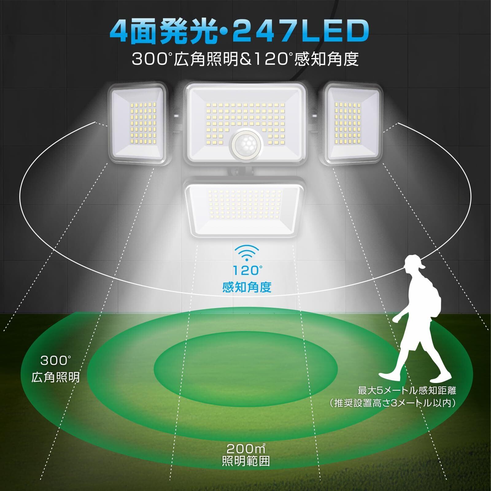 センサーライト ソーラーライト 屋外/屋内 分離型 4面発光 360°角度自由調整 4つモード 光束最大3000ルーメン 5Mケーブル IP65防水 自動点灯 大容量電池内蔵 壁掛け式 玄関/駐車場/庭/ガレージ 停電/防災/防犯対策 太陽光発電 リモコン付き