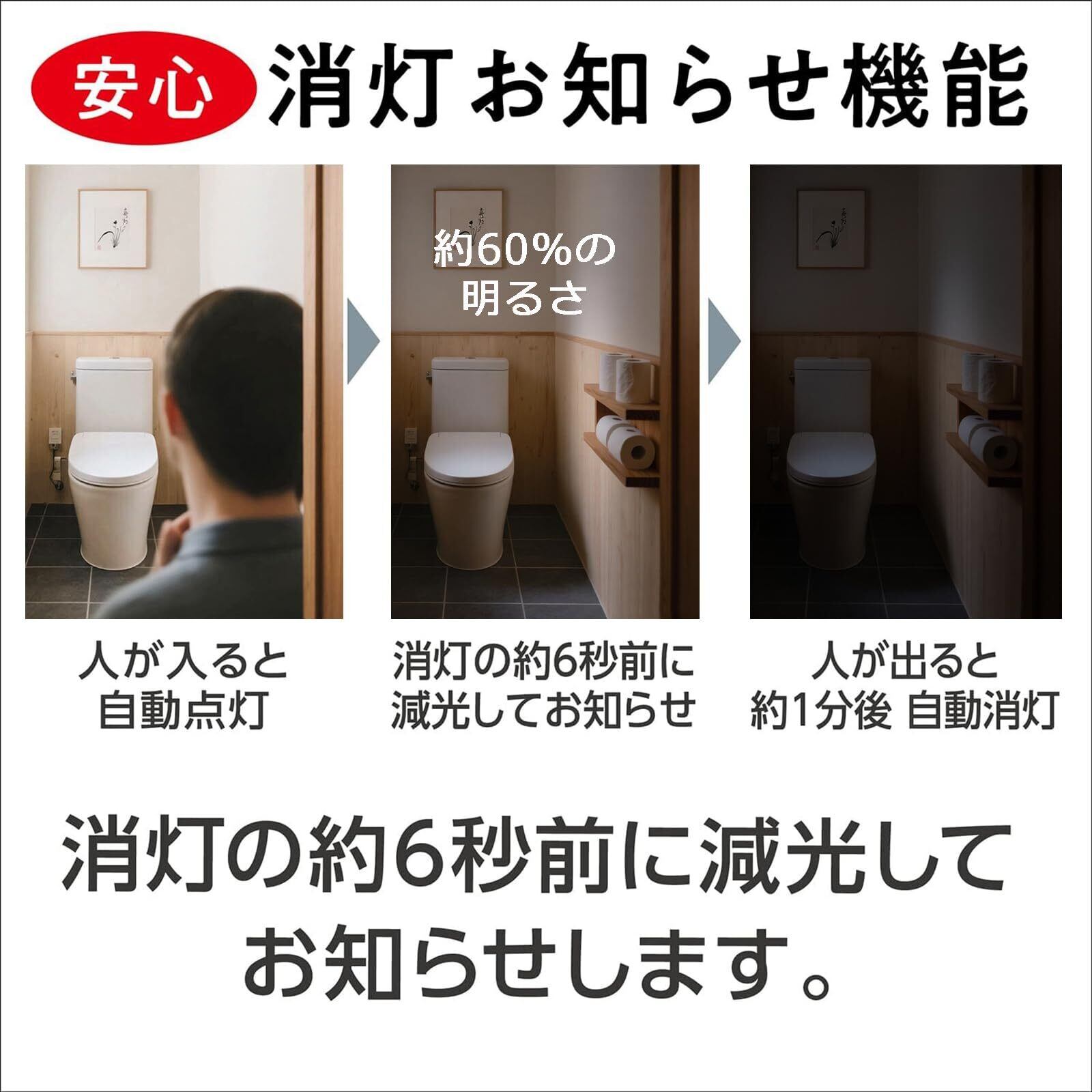 【消灯お知らせ機能搭載のじんかんせんさー 電球 E17】人感センサー電球の検知範囲:直径約6m、検知角度:120°。人の動きを検知すると、自動で点灯します。 約60秒点灯した後、その間に動きが検知されなければ、6秒間「消灯お知らせモード(60%の明るさ)」になります。動きを検知しないと、約6秒後自動で消灯します。(動きを検知し続けると、点灯時間が延長します。)便利に操作でき、無駄な電力を消費しません