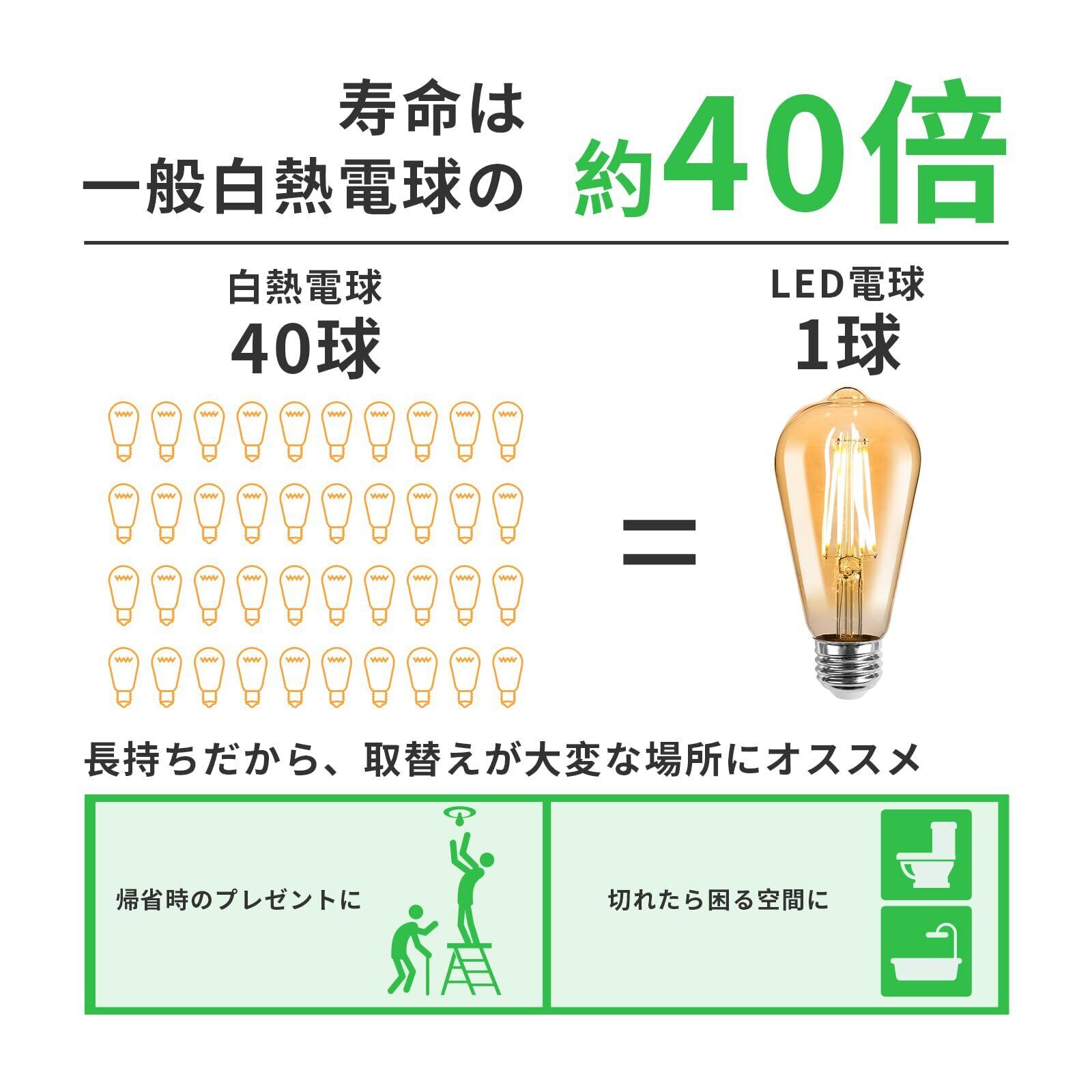【レトロなデザイン】美しい琥珀色が落ち着いた空間を作り、アンティーク照明との相性が抜群!外から電球自体が見えるデザインでありながら、フィラメント相当部分が大きく輝き、照明のデザイン性を損ないません。リラックスした空間を作り出すのにぴったりのLED電球で、お気に入りの照明器具に取り付けるだけでレトロな雰囲気に