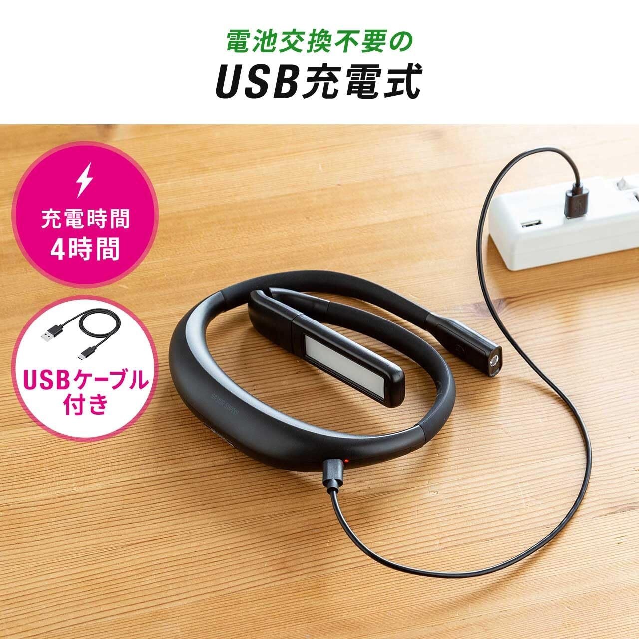 LEDライトは USB充電式 で、充電時間は約4時間です。