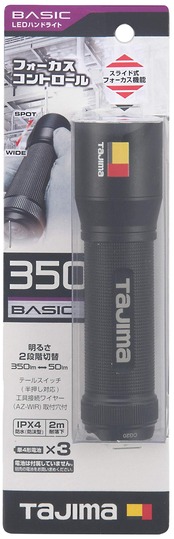 明るさ:最大350lm、使用電池:単4形電池3本
