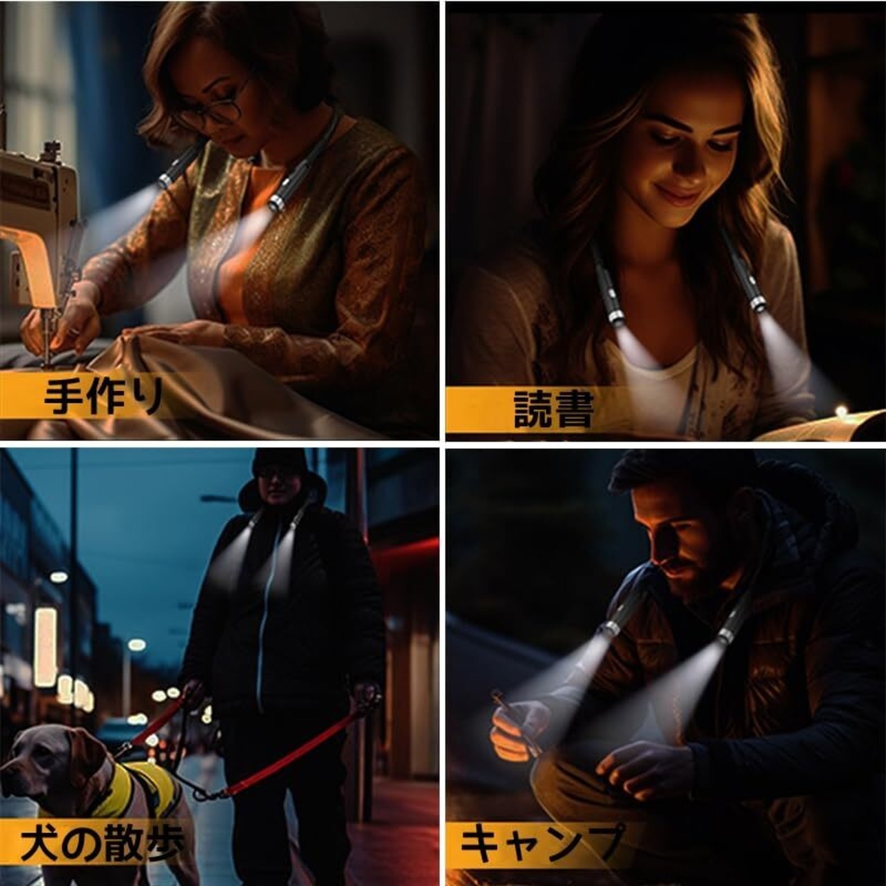 ■【手軽に使える便利な首掛けライト!】このネックライトは、手を使わずに照明を確保できるため、読書や作業、夜間の散歩や釣りに最適です。軽量設計で、ストレスなく首に掛けられるので、どんなシーンでも快適に使用できます。