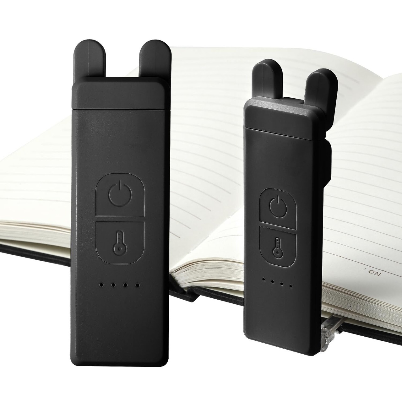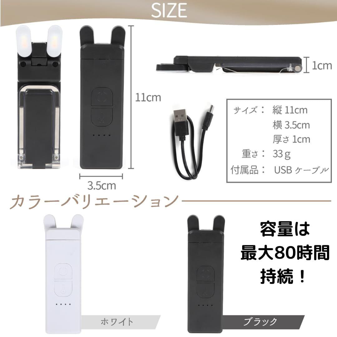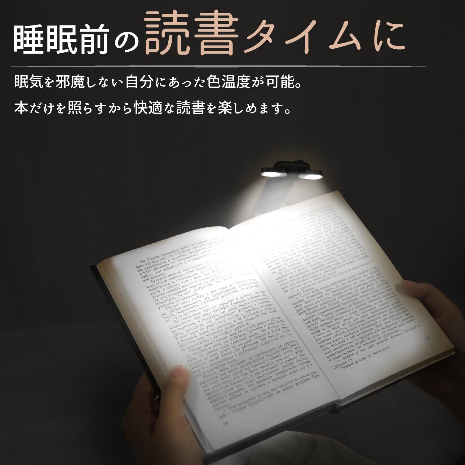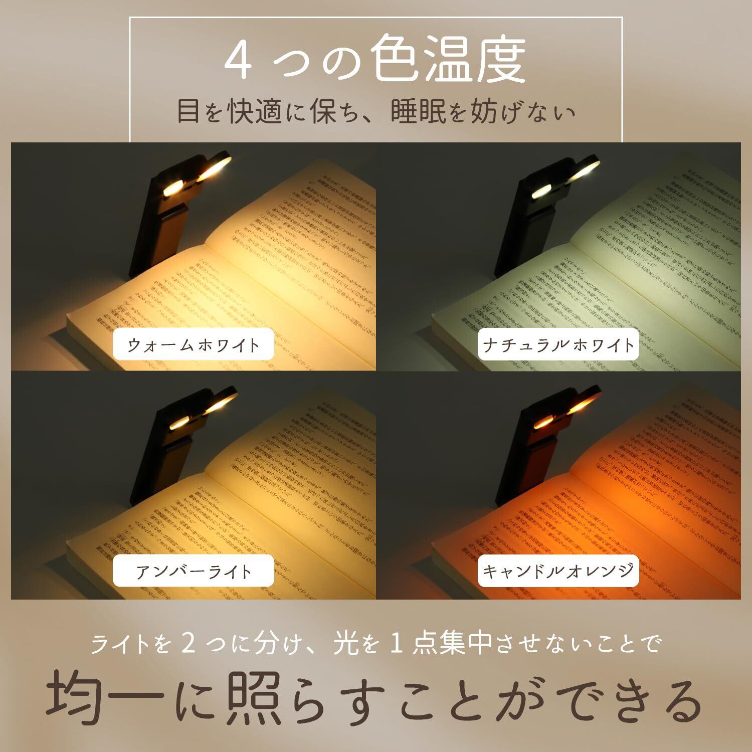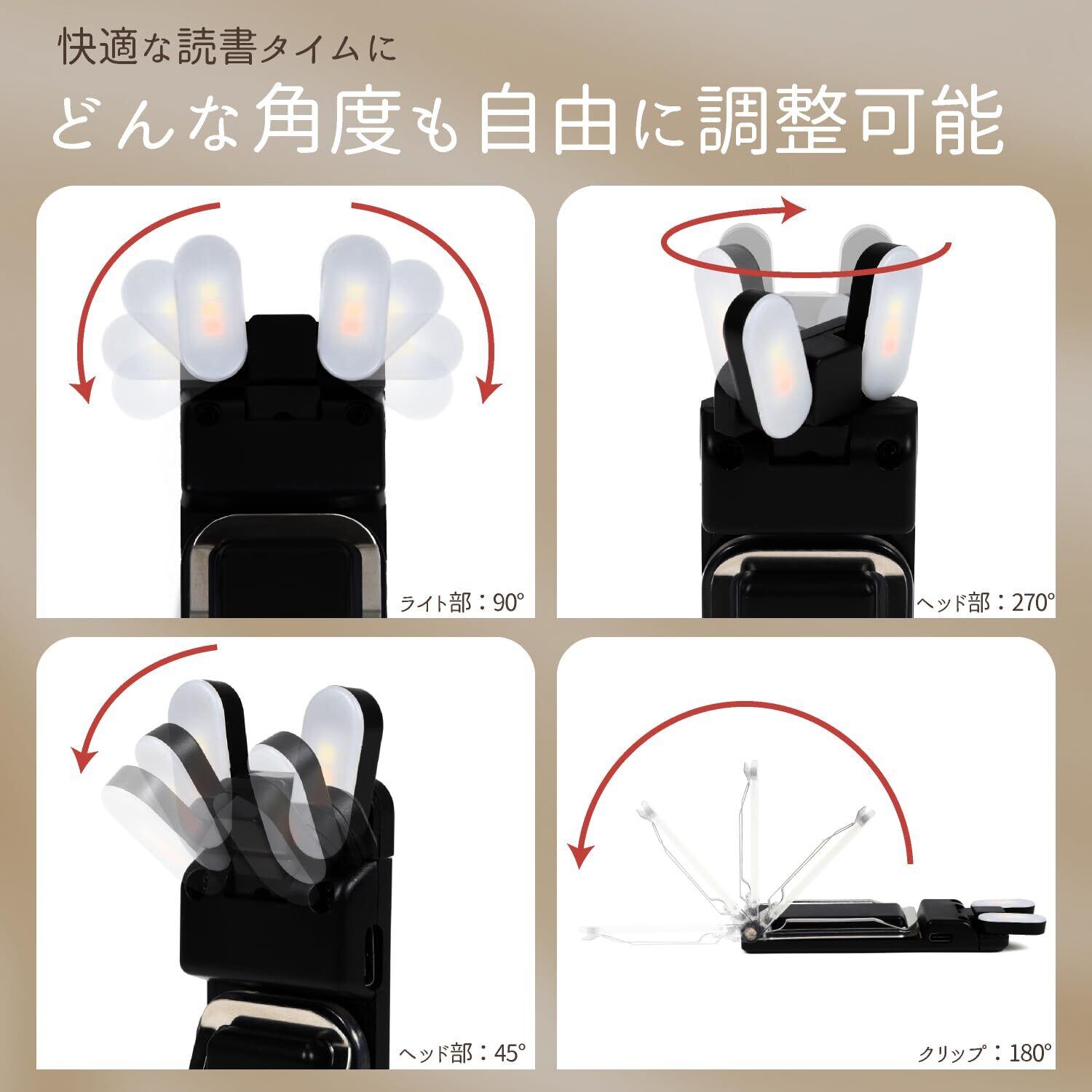 【夜の読書を快適にする専用ブックライト】 目に優しい4段階色温度調整 ウォームホワイトからキャンドルオレンジまで、4つの色温度モードで目に優しく快適な読書時間をサポート。睡眠を妨げずリラックスしたひとときを演出します。 軽量&超薄型デザイン(わずか33g・厚さ1cm) 持ち運びや収納が簡単なスリム設計。旅行や通勤時の読書にも最適です。 USB充電式&長時間使用可能 エコで便利なUSB充電式。バッテリー残量表示付きで急な電池切れの心配なし!フル充電で長時間の読書に対応。 どんな本にも対応可能なクリップ式 180°調節可能なクリップで、厚みのある本から薄い雑誌までしっかり固定。手軽に取り付けられます。 柔軟な角度調整(ヘッド部分270°、ライト部分90°) 光の向きを自由に調整して、どの環境でも最適な照明を提供します。 2カラー展開:ブラック&ホワイト シンプルでスタイリッシュな2色。好みに合わせて選べます。