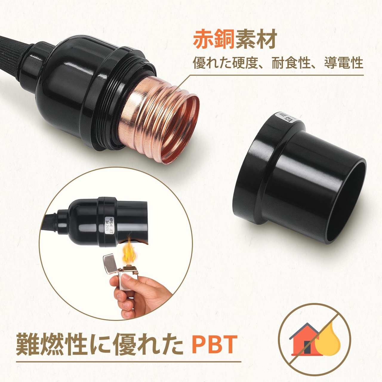 口金:E26 使用可能電球:100Wまで 定格電圧:0-250V カラー:ブラック 素材:硬度、導電性、耐食性に優れた赤銅+難燃性に優れたPBT