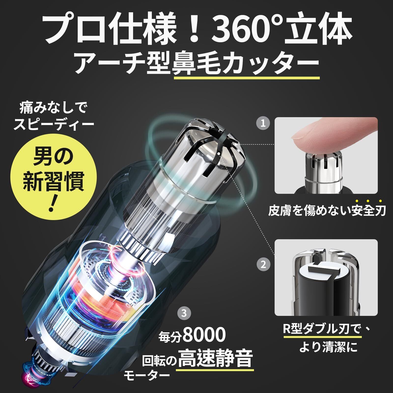 高速回転×低騒音設計(8000回/分):電動カッターには高性能マイクロモーターを搭載し、毎分8000回の高速回転でパワフルにカット。動作音は40dB以下と非常に静かで、耳毛カッターやもみあげシェーバーとしても快適に使えます。肌に優しく、痛みのない使用感を実現。