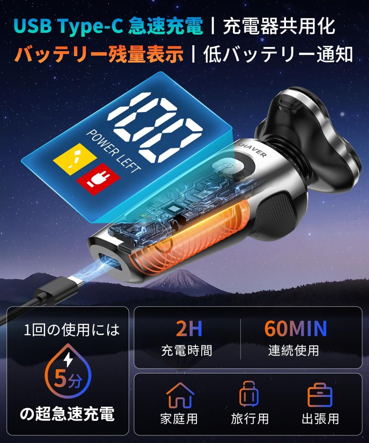 急速充電&USB Type-C この ひげそり 電動シェーバー は完全に充電切れの場合、たった5分の充電で1回分のシェービングが可能です。さらに、USB Type-C充電器とLEDバッテリー表示機能を搭載しています。充電効率が高く、充電器を持ち運ぶ負担がなく、電池残量状態をリアルタイムで把握できます。遅刻の不安から解放され、出張や忙しい生活の中でも、常に身だしなみを整え、より多くの自由な時間を楽しめます。