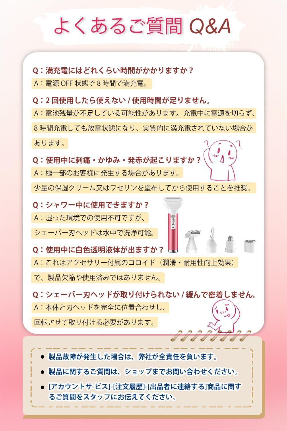 【肌にやさしい&5つのヘッド交換が簡単 】レディースシェーバーは高品質のアレルギー防止ステンレス刃を使っており、肌デリケートな部分の処理も肌に負担をかけずに処理することができます。独特丸い刃先で肌にやさしい。約0.12 mmのうす刃で根元からカット。肌の凹凸に合わせて動く密着スイングヘッドで肌にやさしくシェービング。肌を傷めずに、やさしく深剃りが可能です。5つのヘッドの付け替えがすごい簡単で使いやすいです!効果的に長い毛、短い毛、クセ毛またはムダ毛の根元から取り除けます。(暖かいヒント:電気シェーバーを使用した後は、必ず保湿ケアすることをおすすめします。普段お使いの化粧水や乳液で良いので、忘れずに保湿をするようにしてください。)