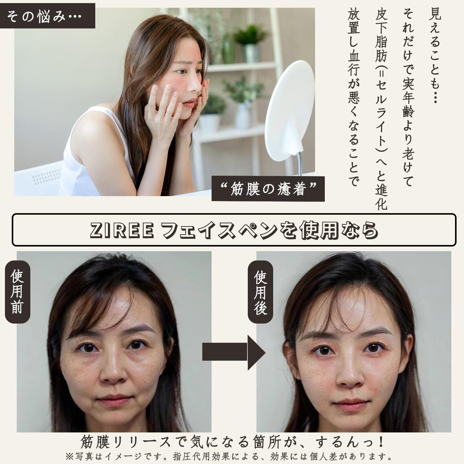 【なぜZIREEティックを選ぶ】 表情筋をしっかり使わないと、筋膜が癒着し、さまざまなエイジ ングサインの原因になります。これを解消するために必要なのが 「筋膜リリース」。しかし、筋膜リリースは深層の筋膜に働きか ける必要があり、セルフケアだけでは限界があります。専門的な技術でしっかりアプローチすることで、より効果的に筋膜の癒着を解消できます。プロ級の加圧ケアを、自宅で簡単に。解決のカギはFACIAL-MASSAGER。体深層研究技術による、精密な筋肉アプローチを実現。
