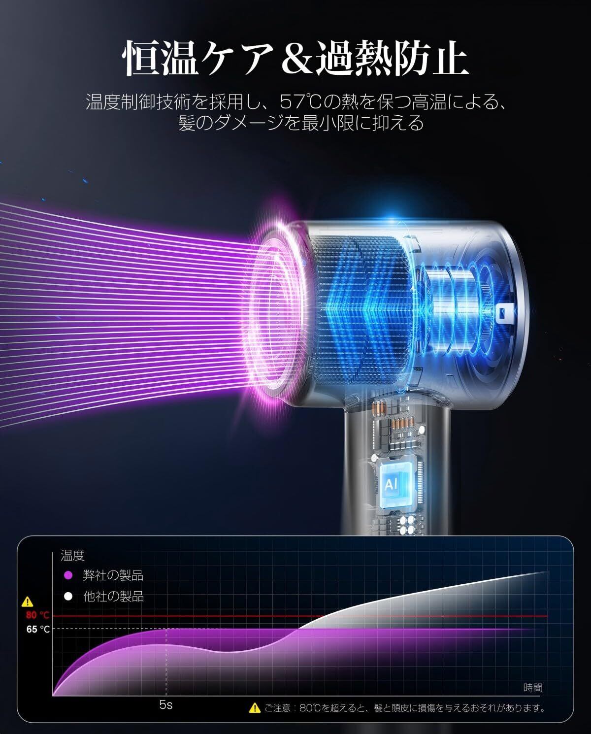■【5段階の温度調整&過熱保護機能!】恒温ヘアケアを実現するNTC温度制御システムにより、安全に髪を乾かすことができます。さらに、過熱保護機能付きで、温度が高まりすぎた際には自動でオフになるため安心です。