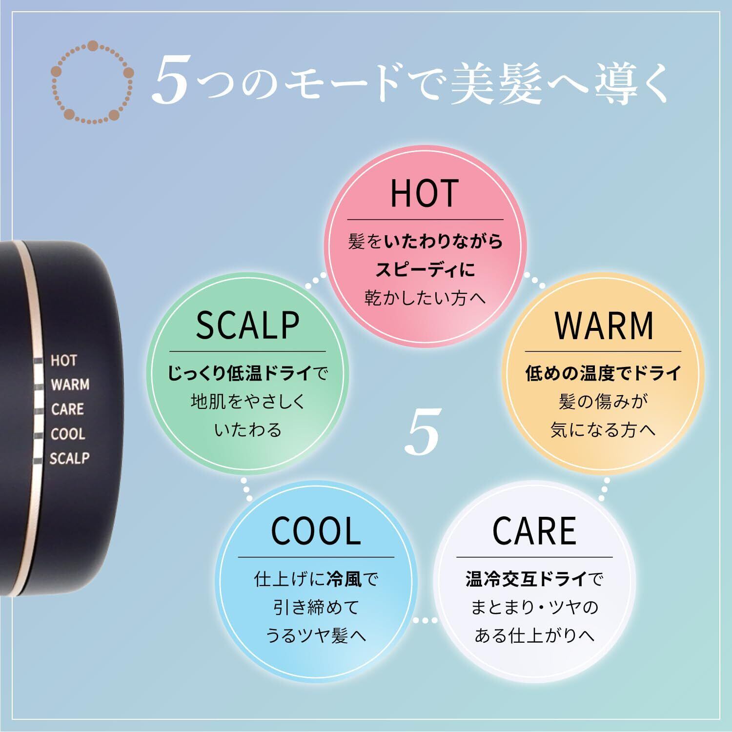5つのモード:ボタン一つで様々な髪質・状況に対応します。HOT(ホット)・WARM(ウォーム)・CARE(ケア)・COOL(クール)・SCALP(スカルプ)