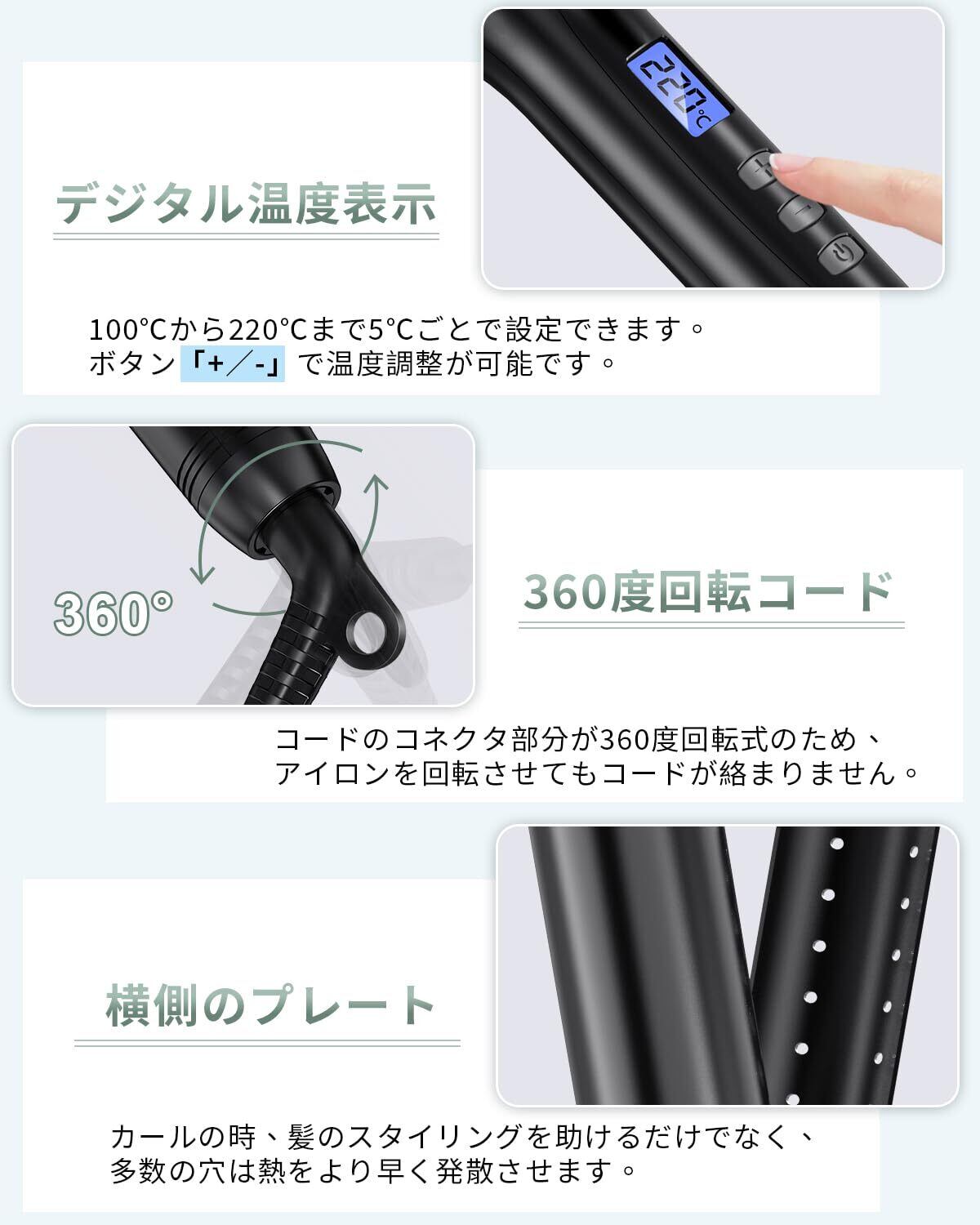 ■【25段階の温度調整機能!】最大220℃まで調整可能な温度設定により、髪質やスタイルに合わせた最適な温度で、ダメージを最小限に抑えたスタイリングが実現します。デジタル温度表示で、簡単に確認できます。