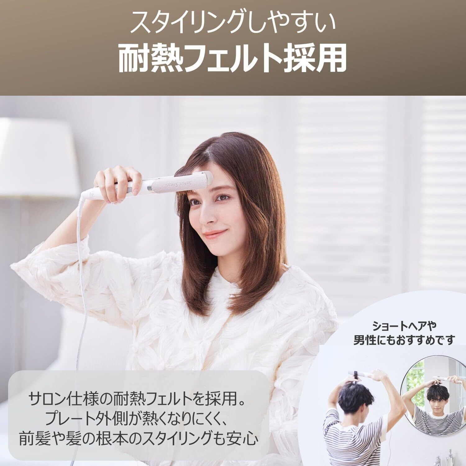 【耐熱フェルト】 サロン仕様の耐熱フェルトを採用。プレート外側が熱くなりにくく、前髪や髪根本のスタイリングも安心。ショートヘアや男性にもおすすめです。