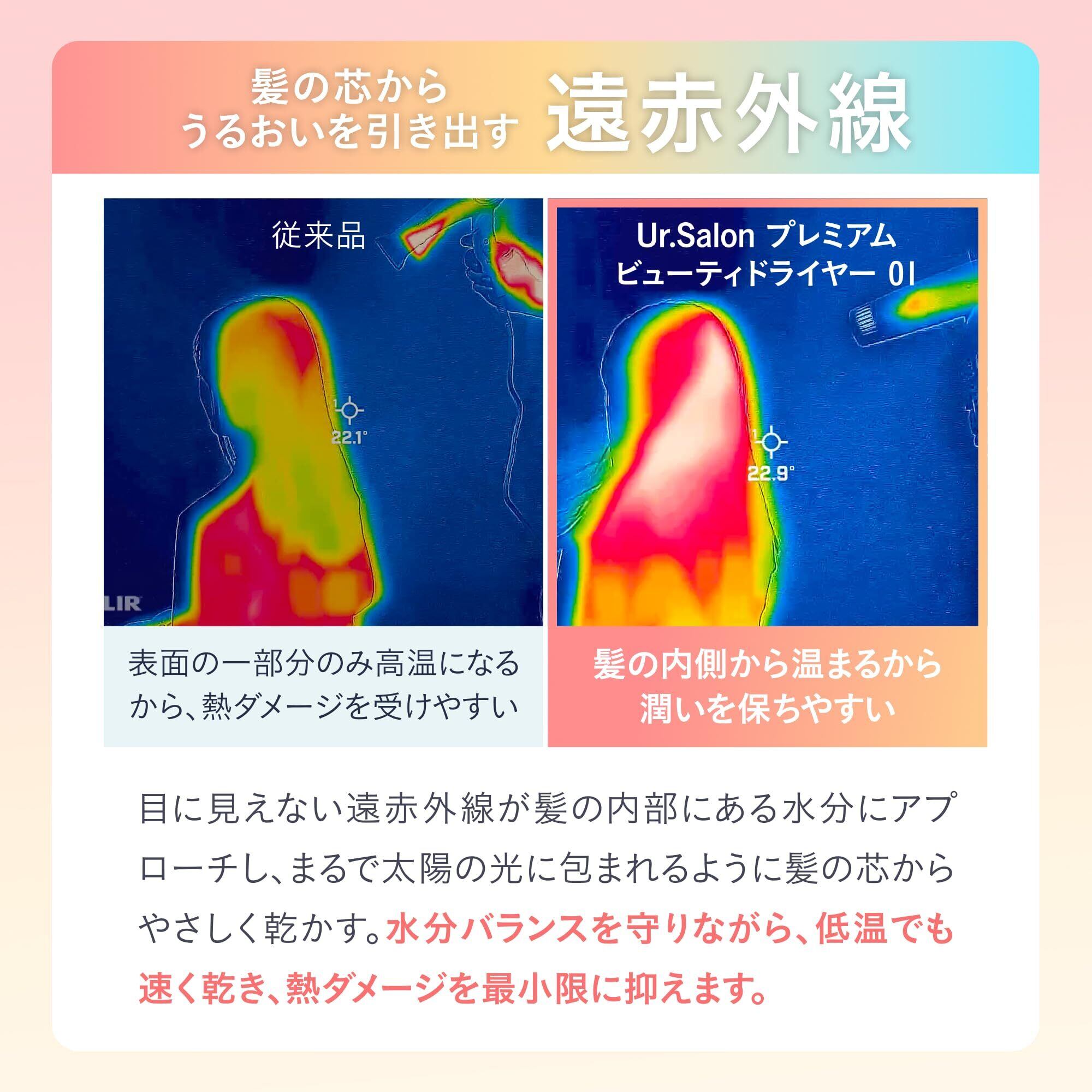 UR.SALON(ユアサロン)は、気持ち艶めく毎日をお届けするライフビューティブランド です。忙しい毎日のなかで、ケアの時間が少しでも心地よくなったなら。そんな想いから、私たちの製品は生まれました。朝、「行ってきます」の身だしなみのセットから。夜、「おつかれさま」と自分をリセットするときまで。そんな、いつもの時間のそばに、そっと寄り添えたらうれしいです。商品詳細 商品名:UR.SALON(ユアサロン) プレミアム ビューティ ドライヤー 01 サイズ:高さ197×幅200×奥行50㎜(使用時)/高さ203×幅92×奥行50㎜(折りたたみ時) 重量:約360g(コード除く) 素材:ABS+PC 製造国:日本企業企画・中国専用工場製 付属品:ノズル、掃除用ブラシ、取扱説明書(1年書付き)