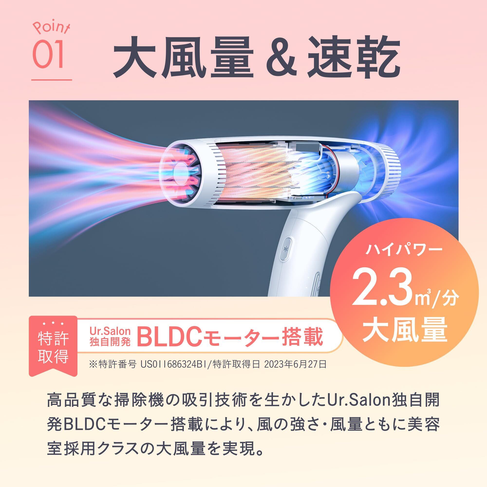 ■【驚異の速乾力を実現!】Ur.Salonのヘアドライヤーは、業界トップクラスの大風量を誇り、髪を瞬時に乾かします。忙しい朝のスタイリングもストレスなく、理想的な仕上がりをサポートします。