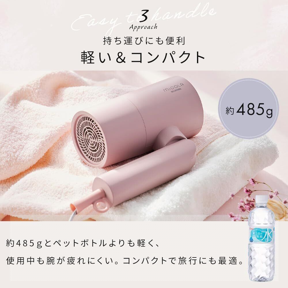 【軽い&コンパクト】持ち運びにも便利な軽くてコンパクトなドライヤーです。重さは約485gと500mlのペットボトルより軽く、ドライヤーの重さによる使用中のストレスを軽減します。さらに使用しないときは折りたたんでコンパクトに収納できます。また旅行の持ち運びにも最適です。