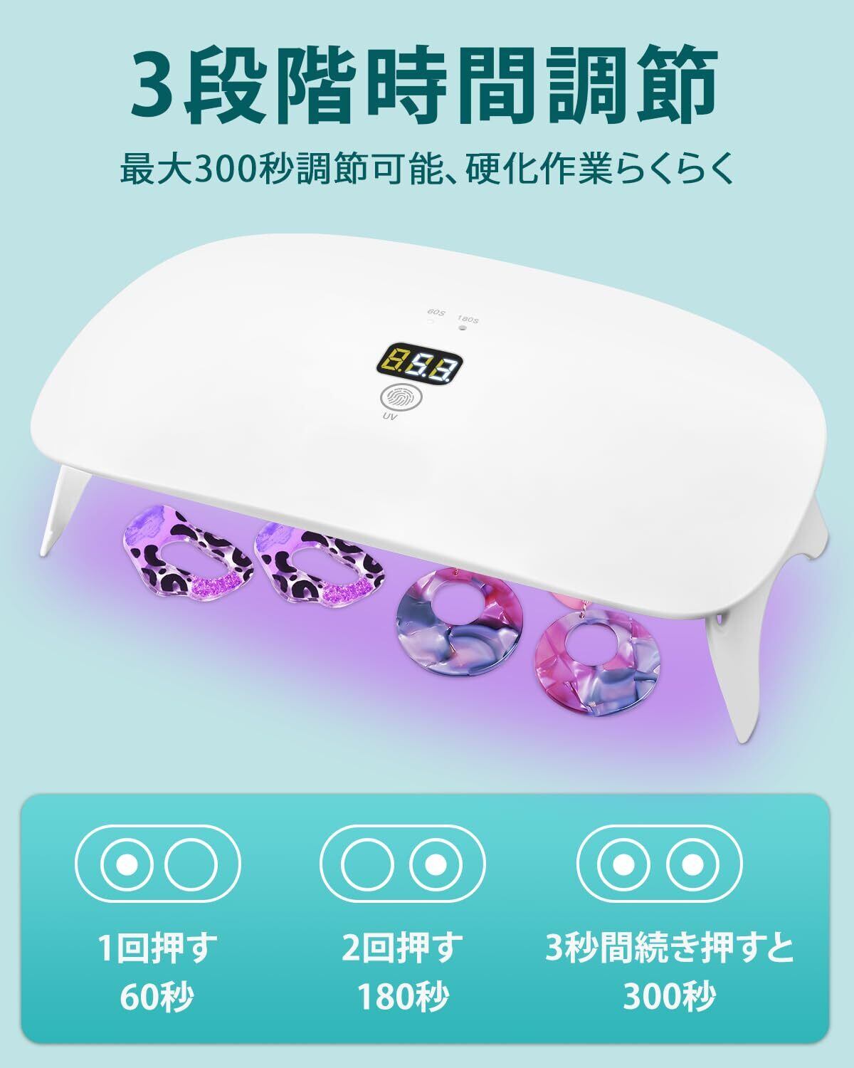 【2段階タイマー】uvライトには60秒、180秒の2段階タイマーが搭載されており、ニーズや好みに応じて選択することができます。スイッチをを毎回押すと、60秒、180秒硬化モードが切り替え、最長180秒をカスタマイズしたため、何度も操作を繰り返す必要はありません。