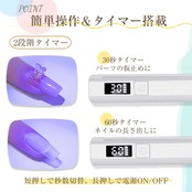 ■【2段階のタイマー機能で使いやすさUP!】30秒と60秒のタイマー機能を搭載しており、ジェルの種類やお好みに応じて最適な硬化時間を選べます。秒数表示があるため、視覚的にもお使いいただきやすいです。