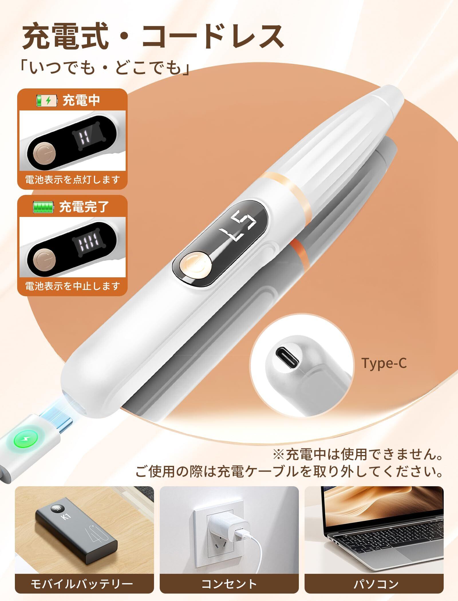 ■【コードレス・USB給電でラクラク移動】USB充電式のため、モバイルバッテリーやPCから手軽に充電ができ、コードレスで使用可能です。自宅はもちろん、外出先や旅行先でも簡単に持ち運びでき、いつでもどこでもネイルケアが楽しめます。