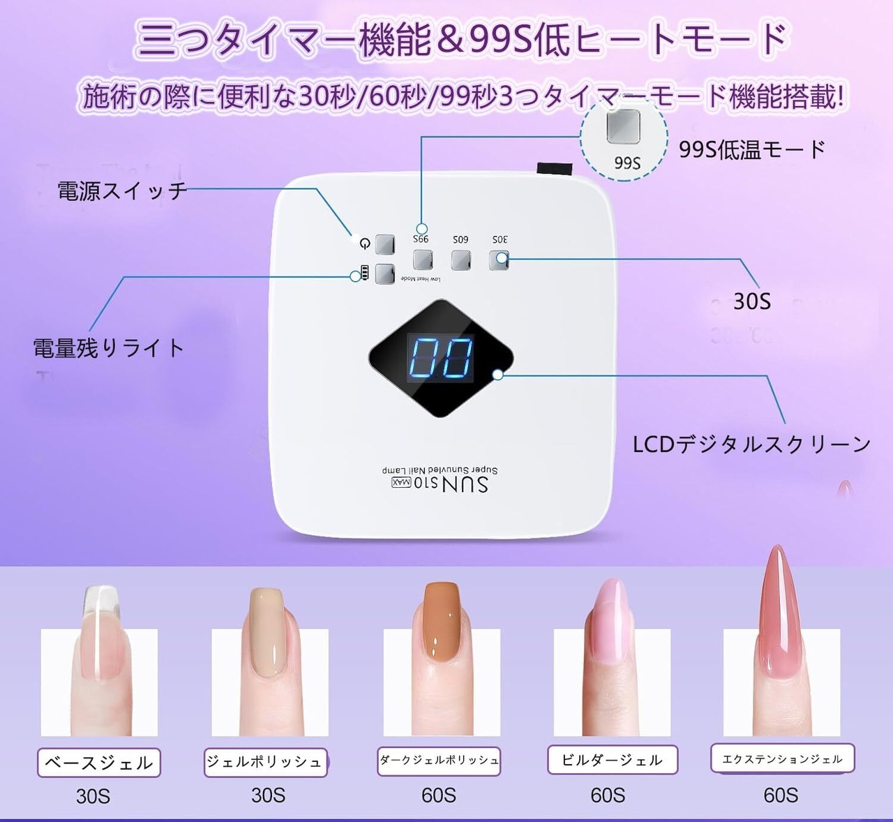 【3つつタイマー機能&タッチスLCD表示】硬化 用 uv ライトには30秒、60秒、99秒 3つのタイマーを搭載します。最新のタッチボタンを配置し、タッチで硬化時間を選択できます。さらに、99S低熱モードが搭載して、硬化熱を和らげます。また、硬化ライトは、全触控の大型液晶ディスプレイを採用しており、残り時間が一目で硬化時間が見やすくになります。これにより、初心者でも簡単に操作でき、ジェルもレジンも楽しみ、ほとんどのジェルネイルに対応しています。