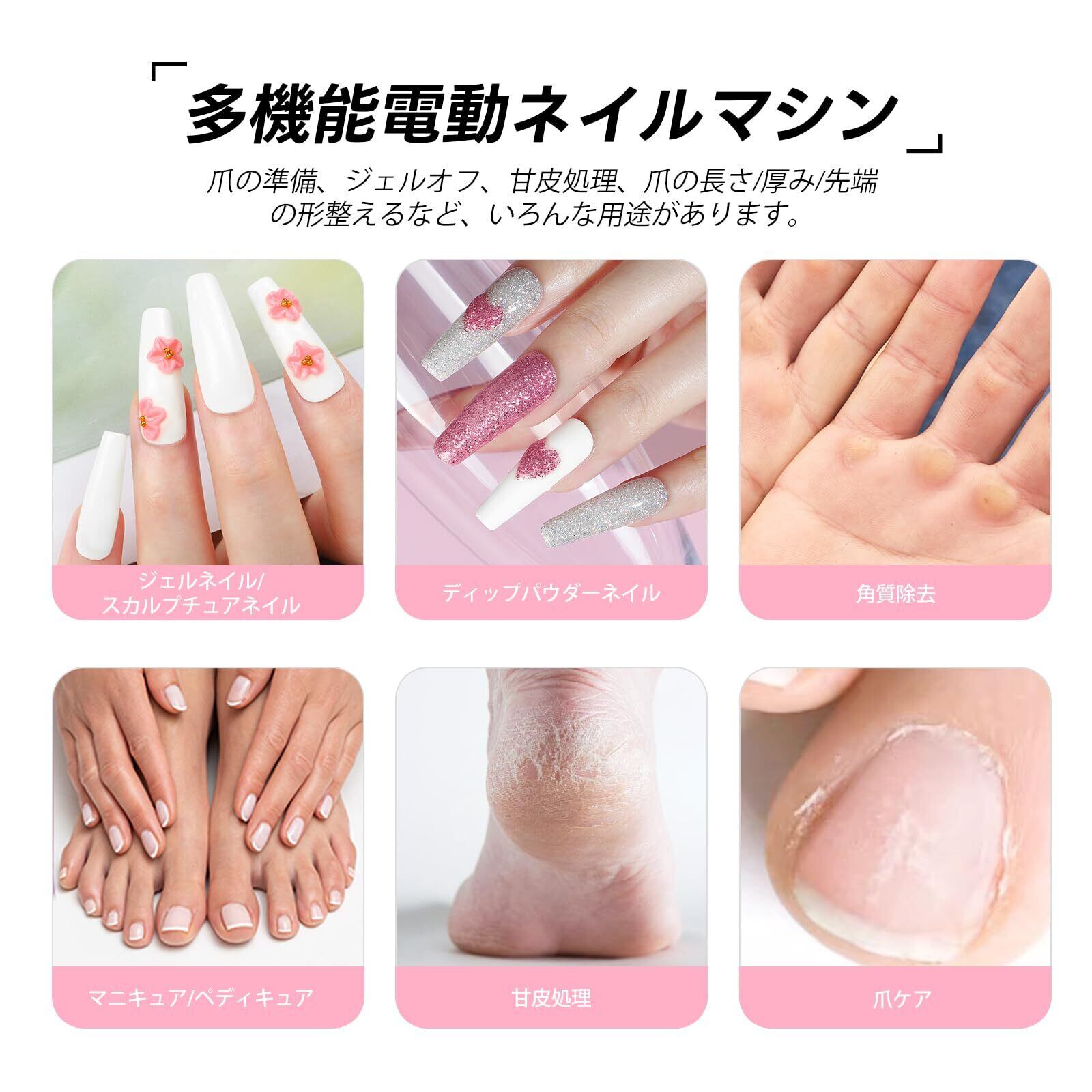 ■【自宅でプロフェッショナルな仕上がり!】PEACECOLORの電動ネイルマシンは、7種類のネイルビットが付属しており、爪のお手入れがこれまで以上に手軽に行えます。ジェルネイルのオフや甘皮処理、角質除去まで幅広く対応し、サロン並みの仕上がりを実現します!