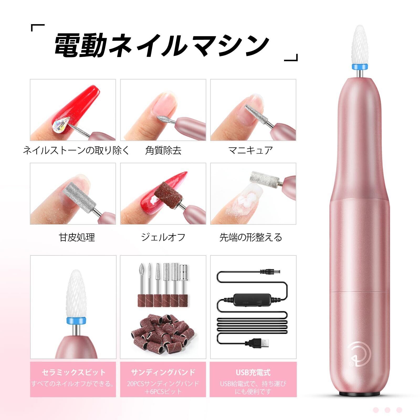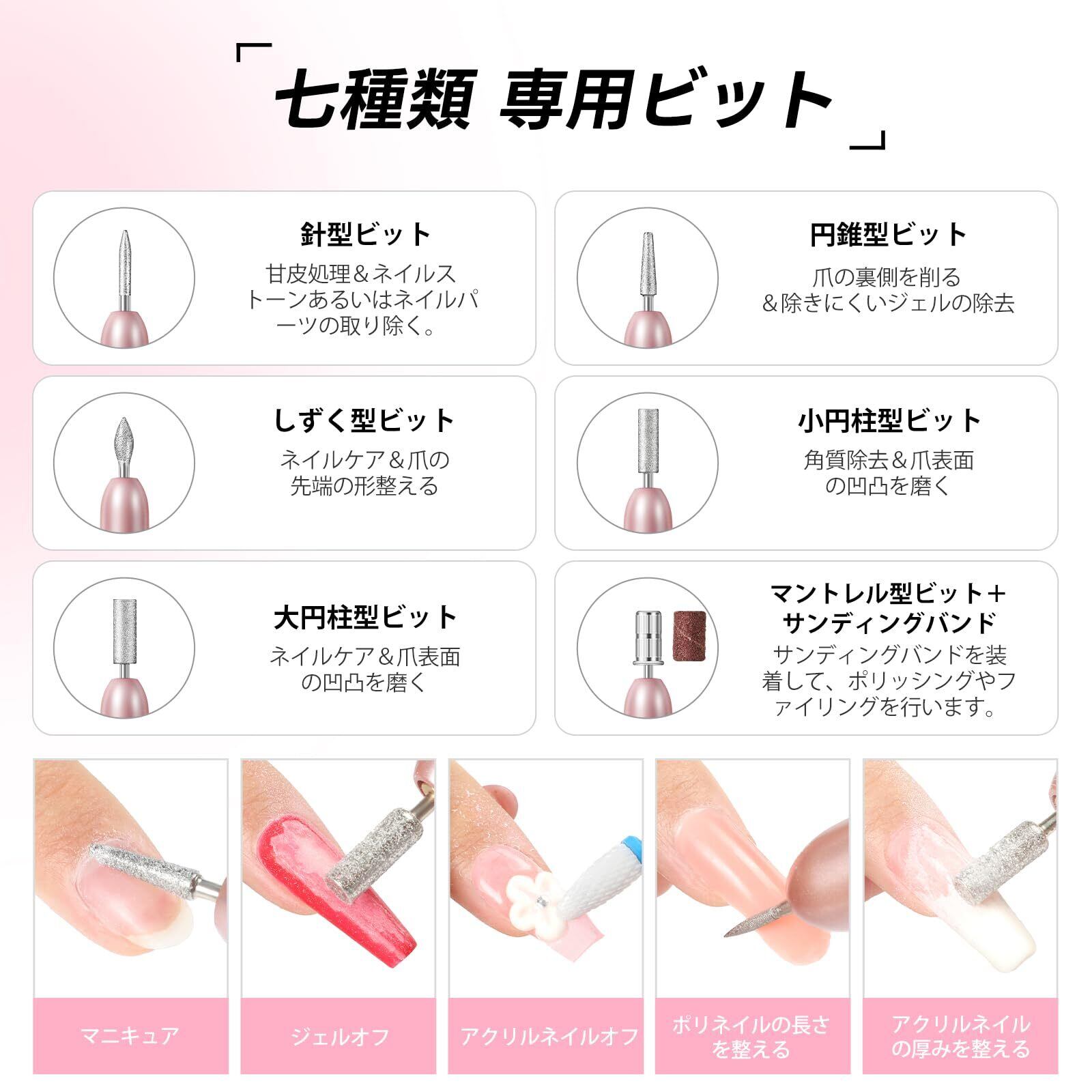 【7種類ネイルビット付け&オフからケアまで適用】ネイルマシンは6個ステンレスビット,1個セラミックビット,20個サンディングバンドを付属しています。爪の準備、ジェルオフ、甘皮処理、爪の長さ/厚み/先端の形整えるなど、いろんな用途があり、幅広く活用できます。それぞれのネイルビットは各場合と異なるニーズに対応することができます。