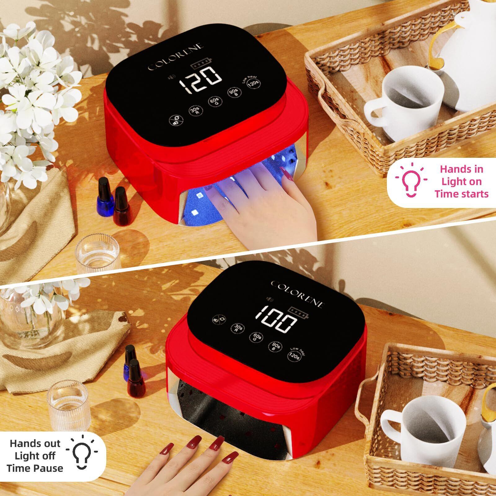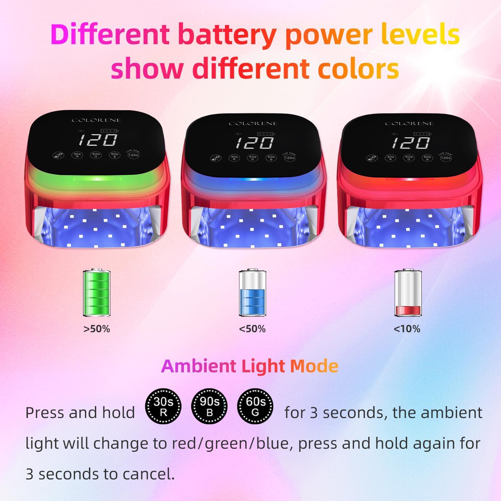 【充電式&コードレス】COLORENE コードレス UV LED ネイルランプは内蔵充電式バッテリーを備えており、3 時間充電して 3 - 4 時間使用できます。コードに惑わされることなく、どこでもお楽しみいただけます。