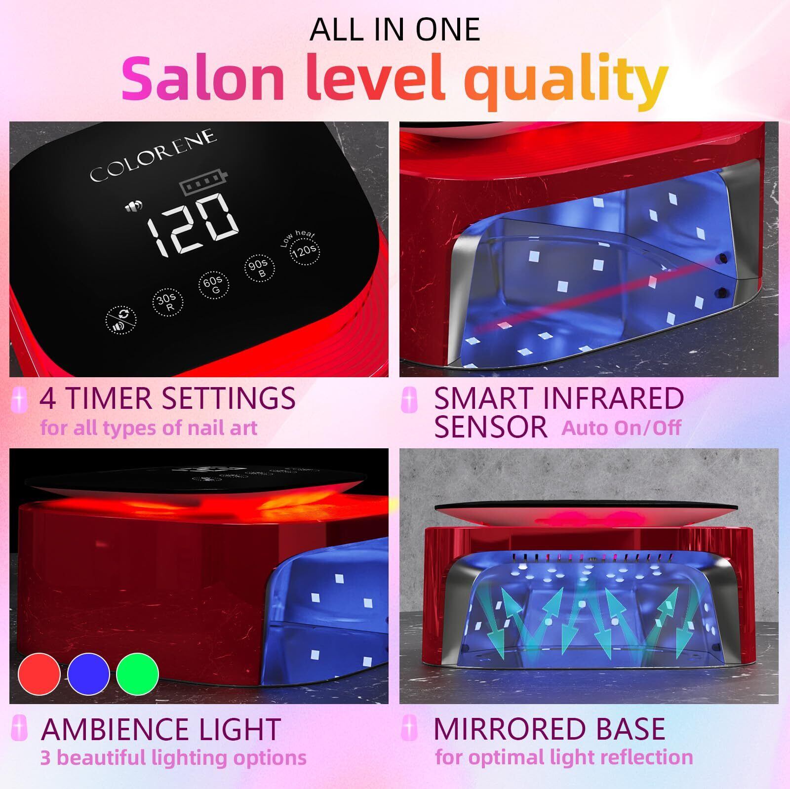 【30 ビーズとデュアル波長】30 個の UV ビーズで最大 60W の電力、デュアル光波长(365nm + 395nm)のランプビーズを備え、あらゆる角度から各種のネイルポリッシュを迅速に硬化できます。簡単なネイルのための 120 秒スマート無痛モードも選択できます。